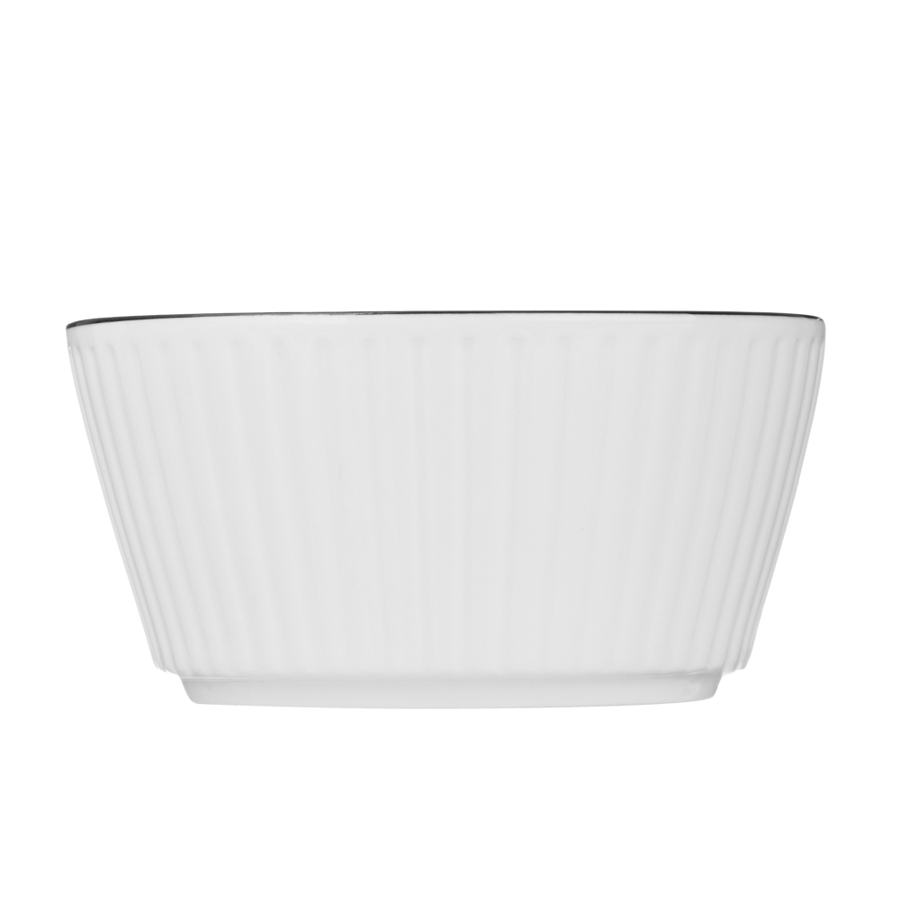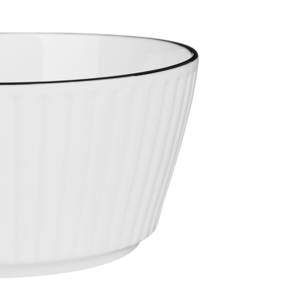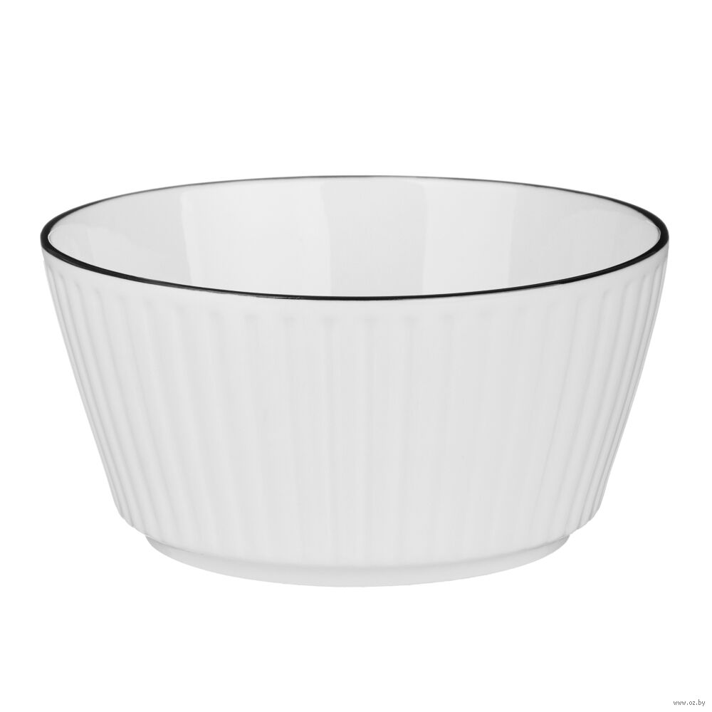 Фарфоровый салатник "Соло" – это элегантная посуда для праздничной и повседневной сервировки. Имеет лаконичный дизайн в белом цвете с рельефными стенками и черной отводкой по кромке, которая создает яркий контраст и придает изделию благородный вид.