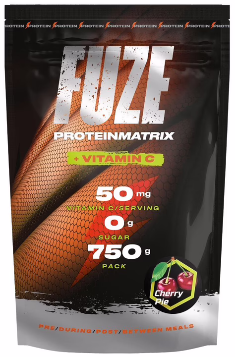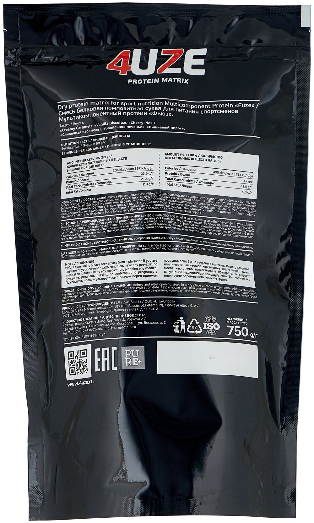 Мультикомпонентный протеин "Fuze" в качестве источника протеинов, использует смесь животных белков (яичный белок, белок молочной сыворотки, казеин), а также углеводы (глюкоза).