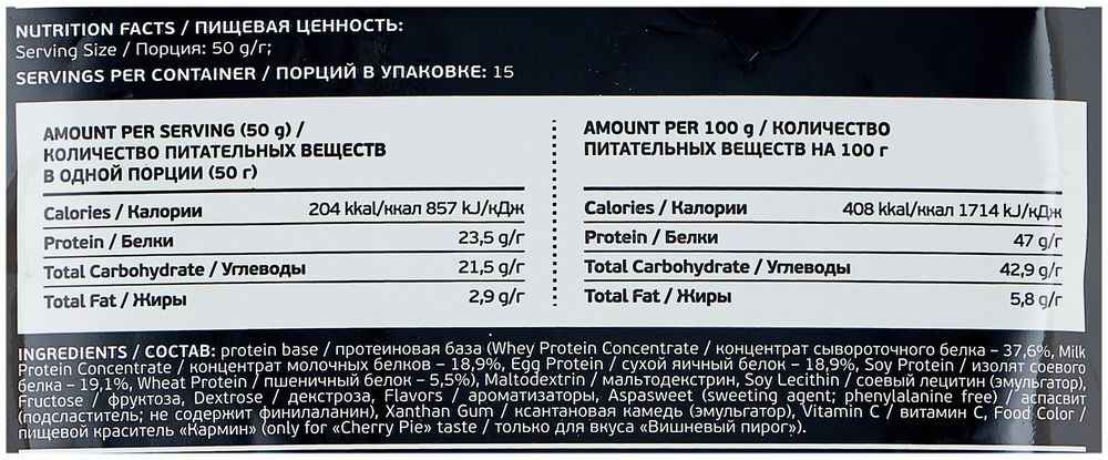 Протеиновая матрица (концентрат сывороточного белка - 37,6%, концентрат молочных белков - 18,9%, яичный белок - 18,9%, изолят соевого белка - 19,1%, пшеничный белок - 5,5%), мальтодекстрин, декстроза, алкализованное какао порошок (для вкусов шоколадное печенье и молочный шоколад), соевый лецитин (эмульгатор), пищевая клетчатка (для вкусов вишневый пирог и сливочная карамель), ксантановая камедь (эмульгатор), ароматизатор, витамин С, сукралоза (подсластитель), пищевой краситель кармин (для вкуса вишневый пирог).Способ приготовления