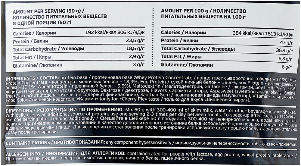 Протеиновая матрица (37.6% концентрат сывороточного белка, 18.9% концентрат молочных белков, 18.9% яичный белок, 19.1% изолят соевого белка, 5.5% пшеничный белок), мальтодекстрин, L-Глутамин, алкализованный какао-порошок (для вкусов "шоколадное печенье" и "молочный шоколад"), соевый лецитин (эмульгатор), пищевая клетчатка (для вкусов "вишневый пирог" и "сливочная карамель"), декстроза, ксантановая камедь (эмульгатор), ароматизатор, витамин С, сукралоза (подсластитель), пищевой краситель кармин (для вкуса "вишневый пирог").Способ приготовления