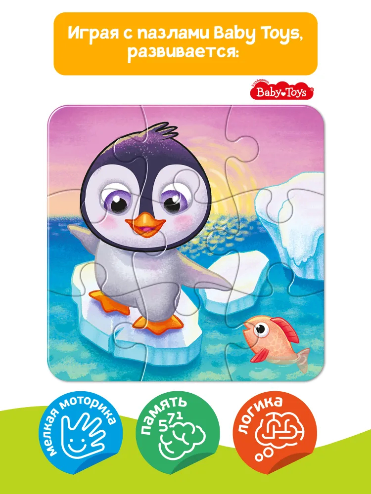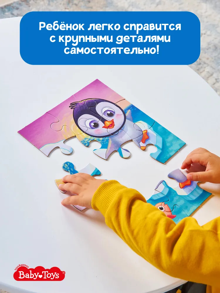 Соберите красочную картинку с изображением пингвинёнка из пазлов! Крупные яркие пазлы будут отличным досугом для малыша, который любит самостоятельно собирать яркие картинки.