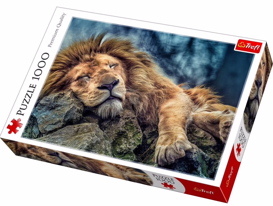 Пазл "Спящий лев", состоящий из тысячи элементов, отображает величественного льва, короля зверей, мирно сопящего на камнях.