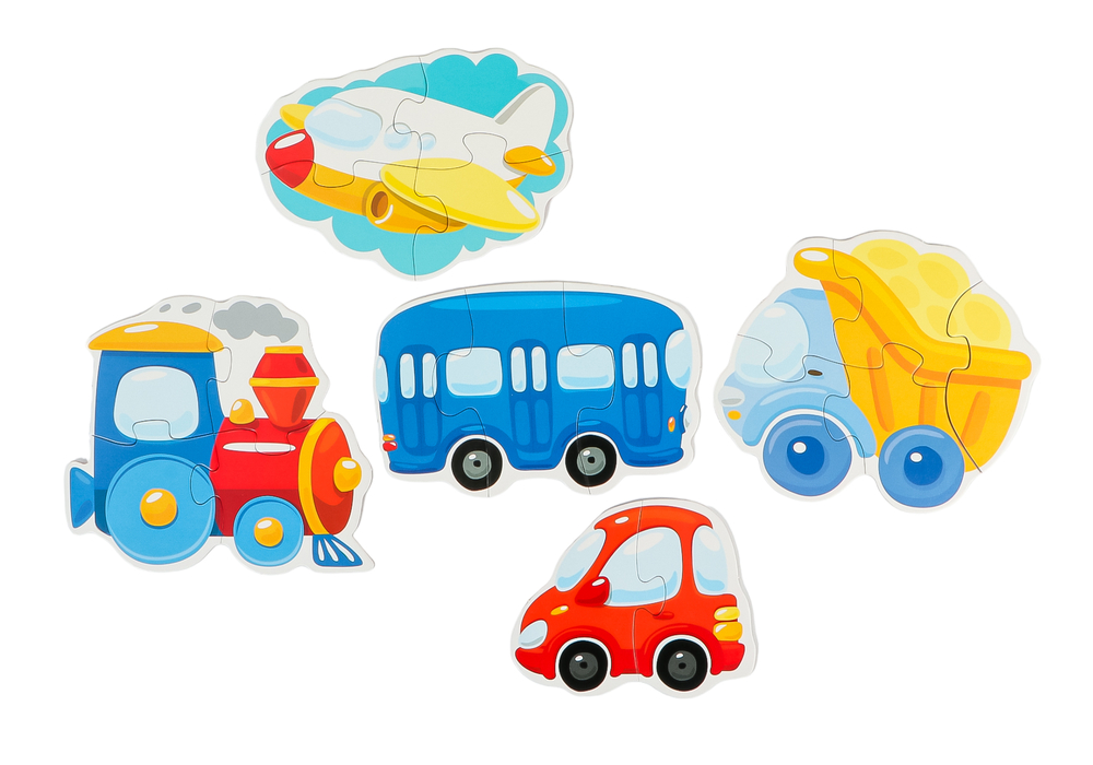 С набором контурных пазлов "Транспорт" малыш сможет собрать фигурки 5 транспортных средств: автобус, паровоз, автомобиль, самолёт и грузовик. Каждая фигурка состоит из нескольких частей (от 2 до 5), что позволяет разбить игру на уровни сложности, собирая пазлы от самых простых к более тяжёлым.