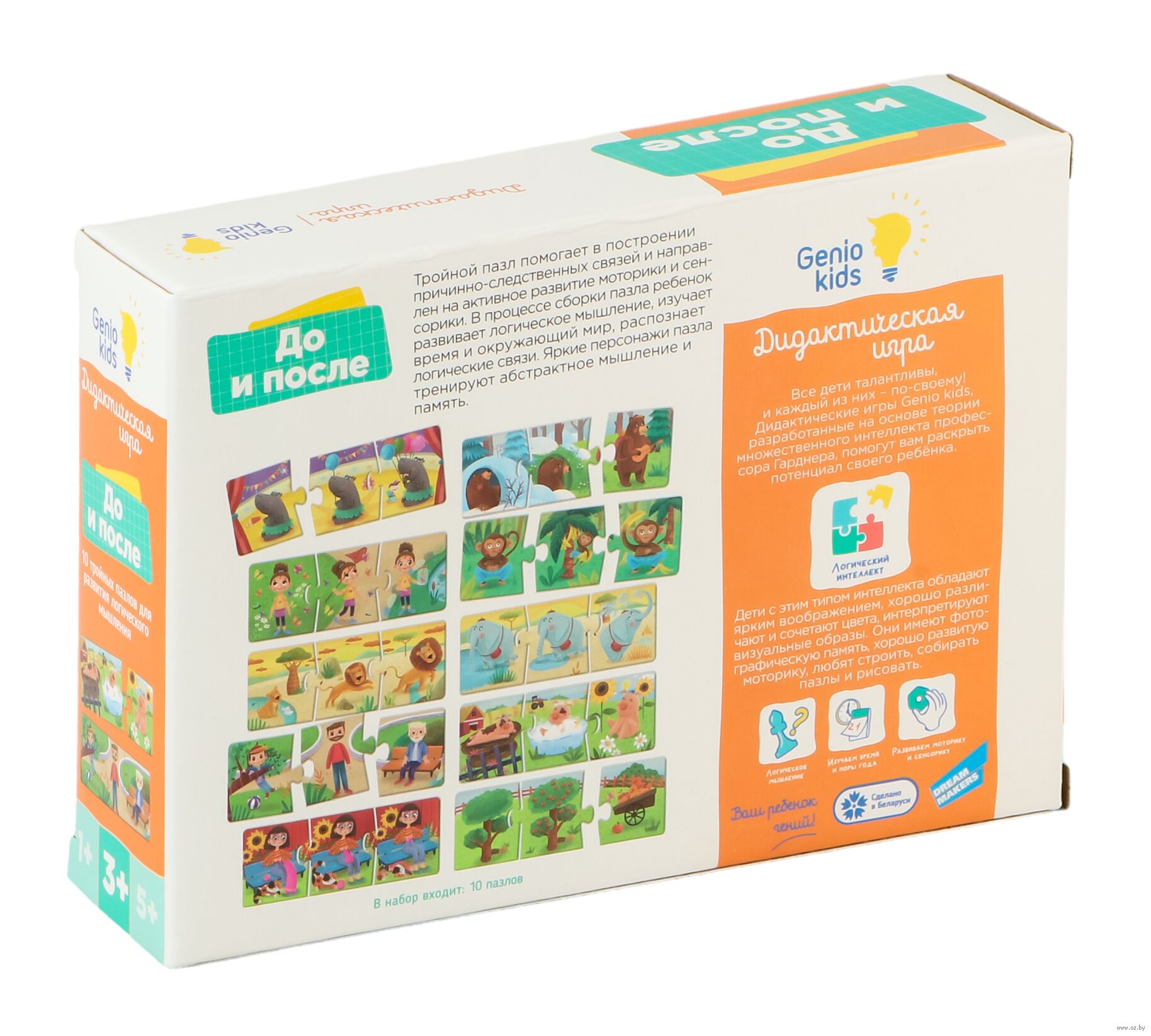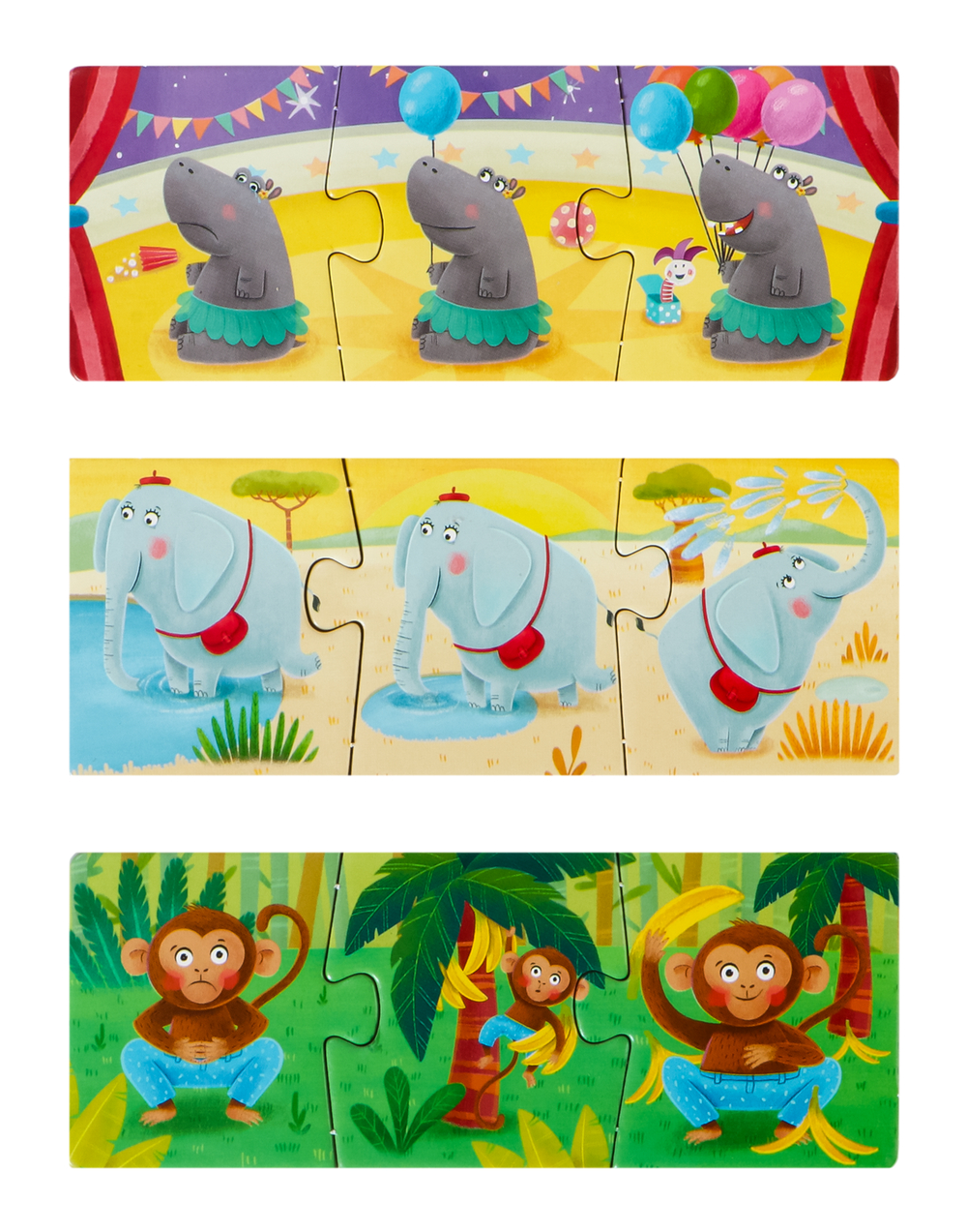 Тройной пазл помогает в построении причинно-следственных связей и направлен на активное развитие моторики и сенсорики.