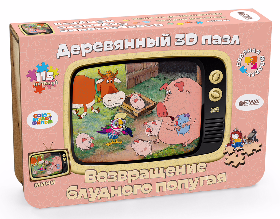Деревянный пазл "Возвращение блудного попугая" из коллекции "Союзмультфильм" – это захватывающий способ провести время с друзьями и семьей, вспоминая советские мультики.