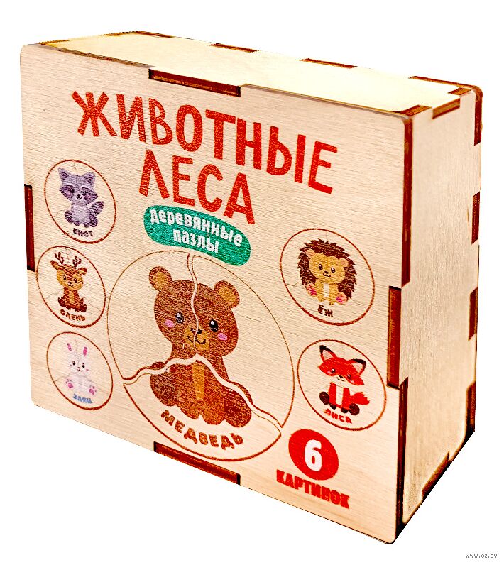 Деревянные пазлы для детей – интересная развивающая игра с элементами из древесного материала (экологичной березовой фанеры). На картинках изображены животные – олень, медведь, лиса, заяц, енот, ёж. Края элементов закруглены и тщательно обработаны.