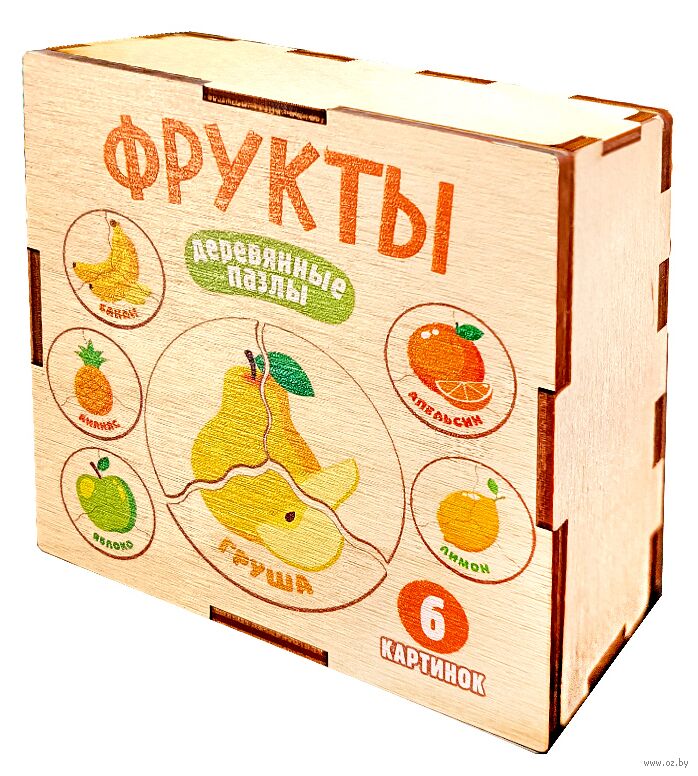 Деревянные пазлы для детей "Фрукты" (6 картинок) – интересная развивающая игра с элементами из древесного материала (экологичной березовой фанеры). На картинках изображены фрукты и овощи – ананас, банан, апельсин, груша, яблоко, лимон. Края элементов закруглены и тщательно обработаны.