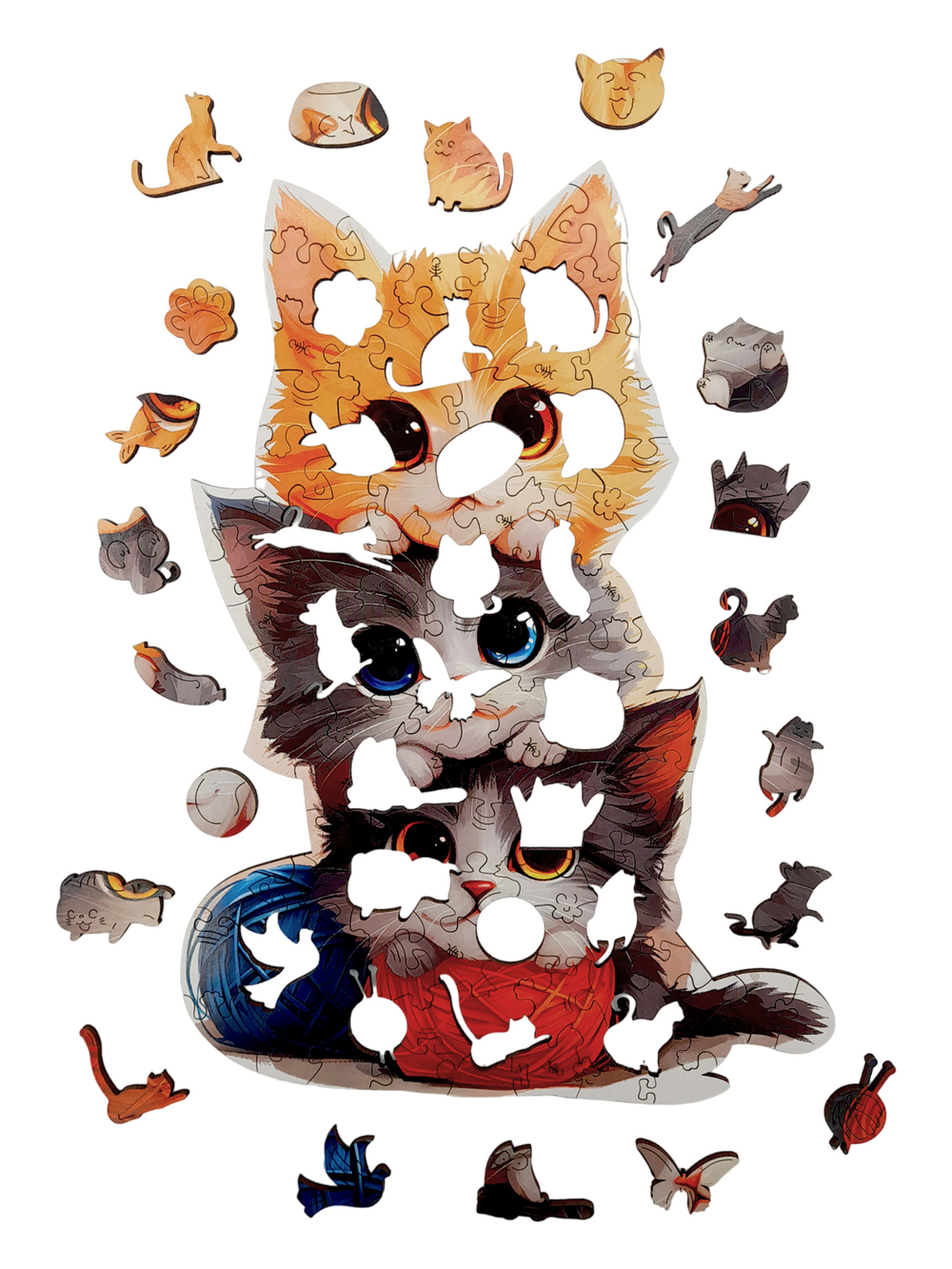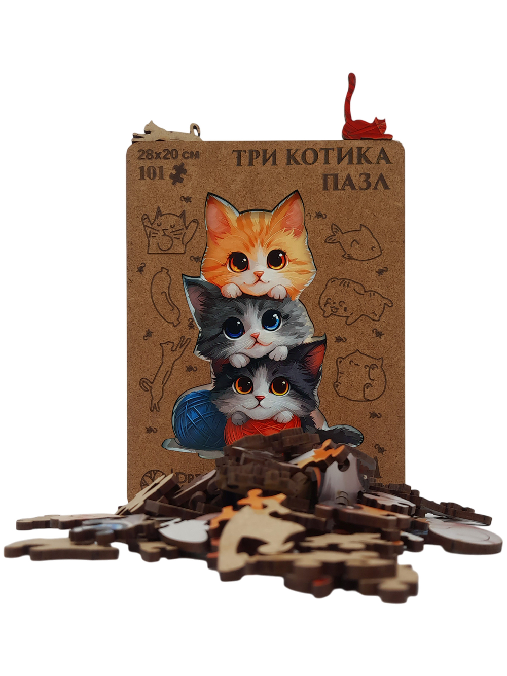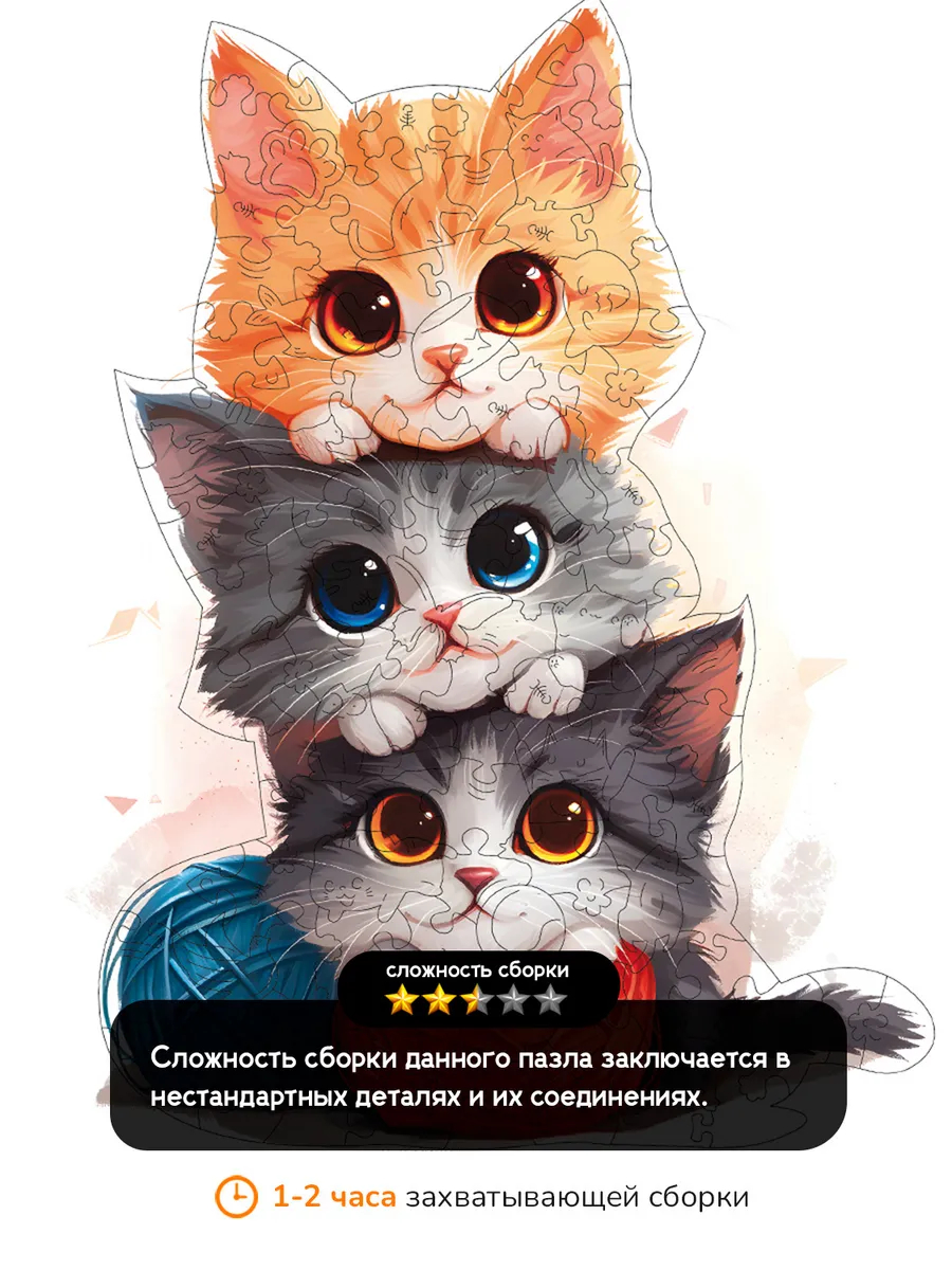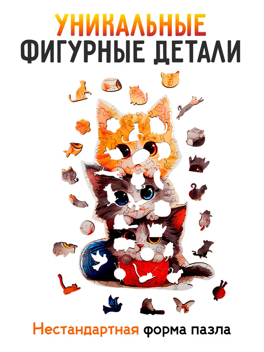 Три котика – нестандартный пазл: он состоит из элементов не единой, а разнообразной формы.