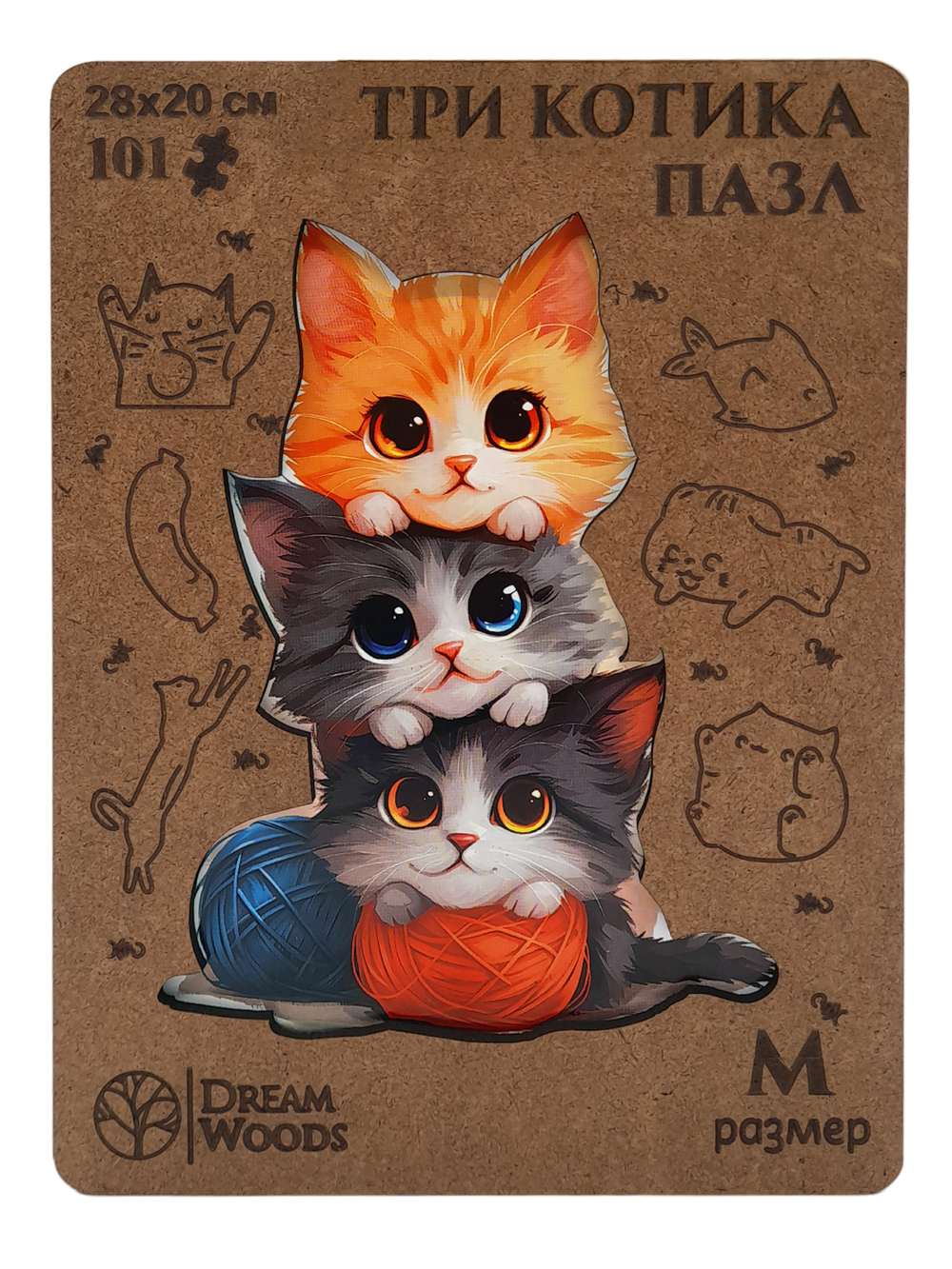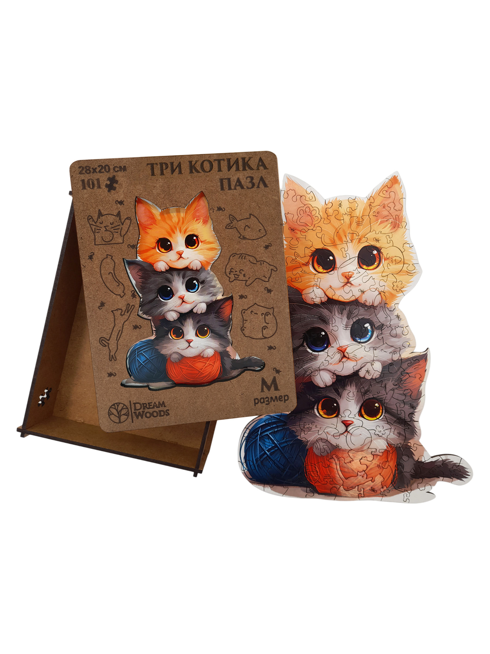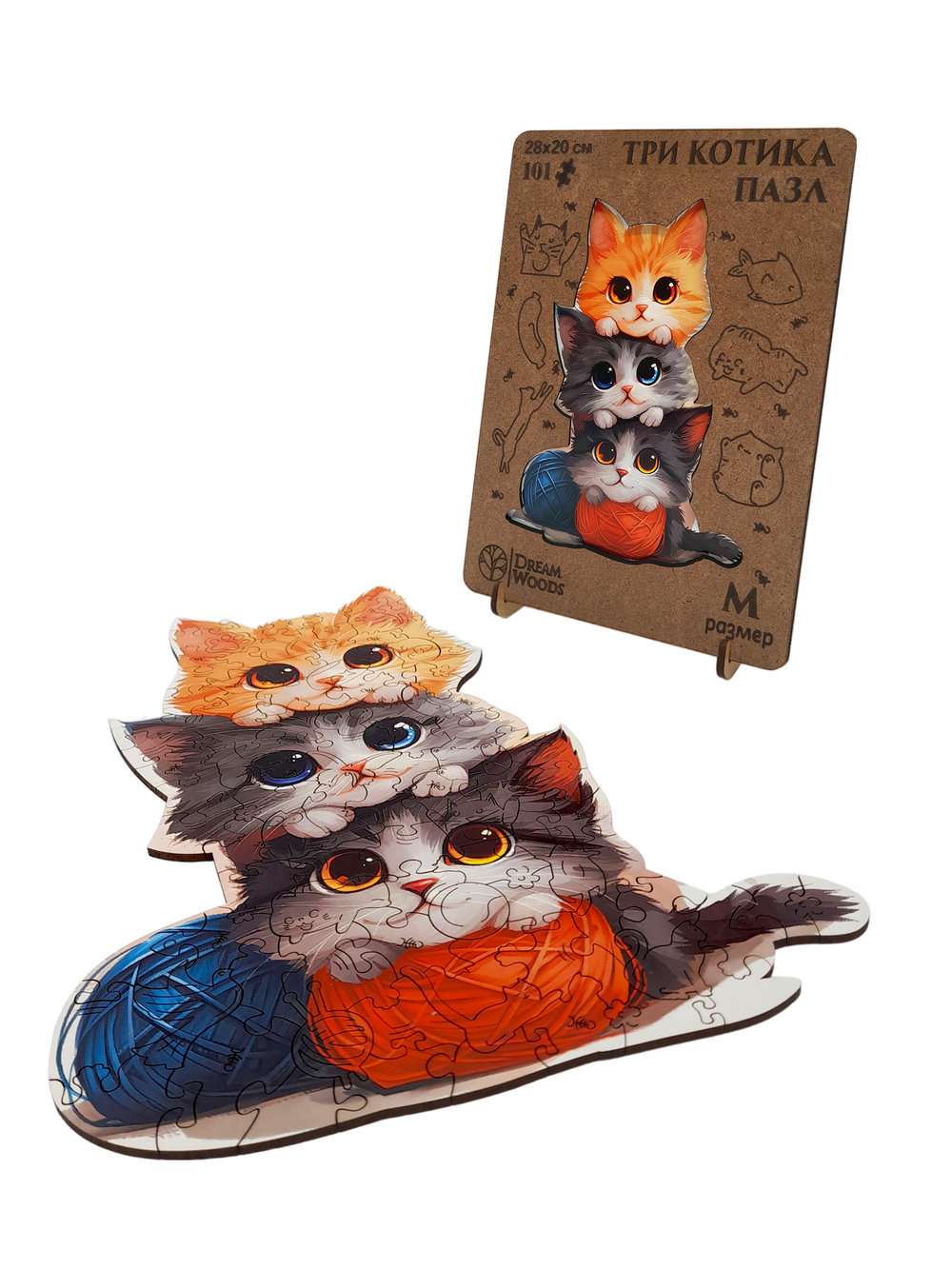 Три котика – нестандартный пазл: он состоит из элементов не единой, а разнообразной формы.