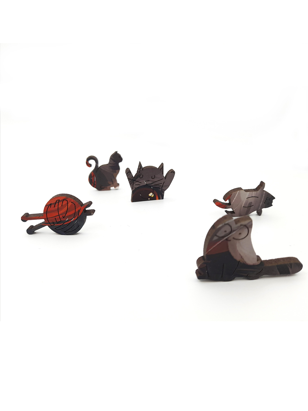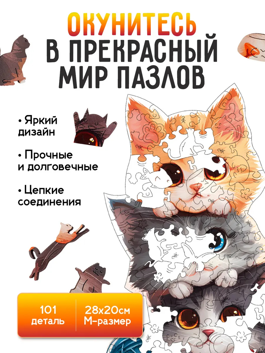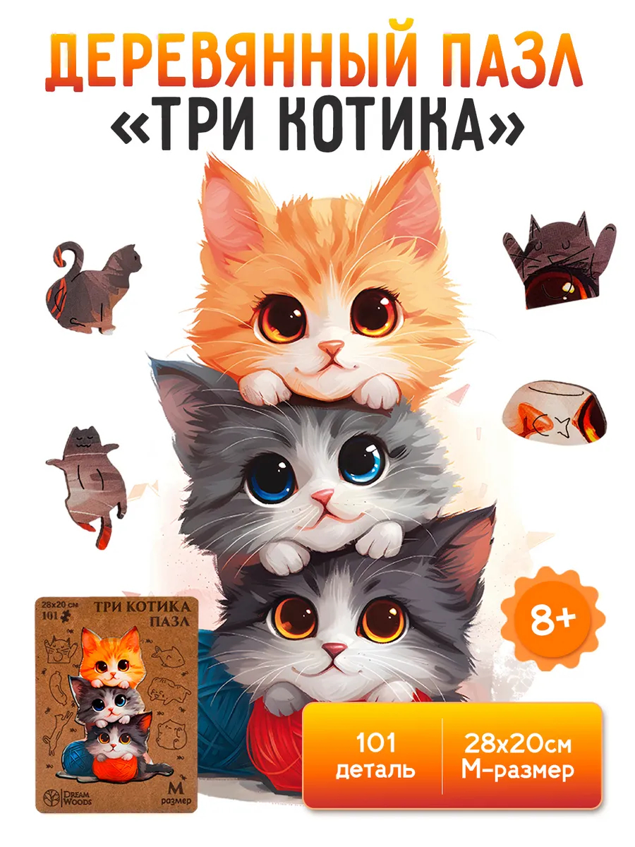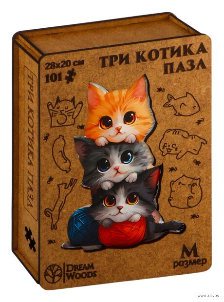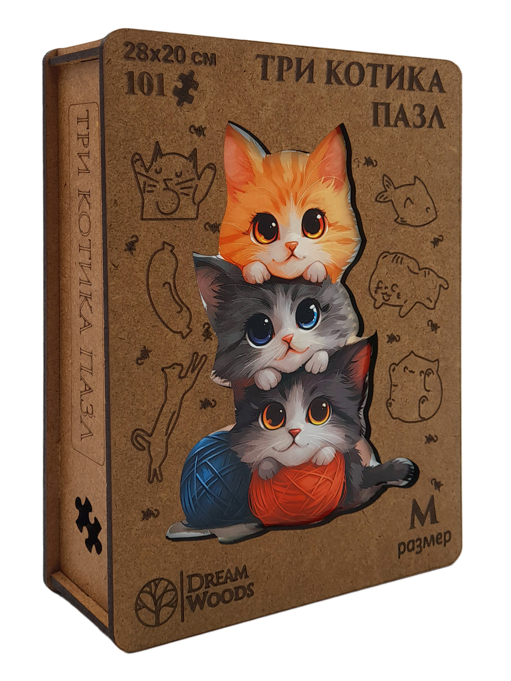 Три котика – нестандартный пазл: он состоит из элементов не единой, а разнообразной формы.