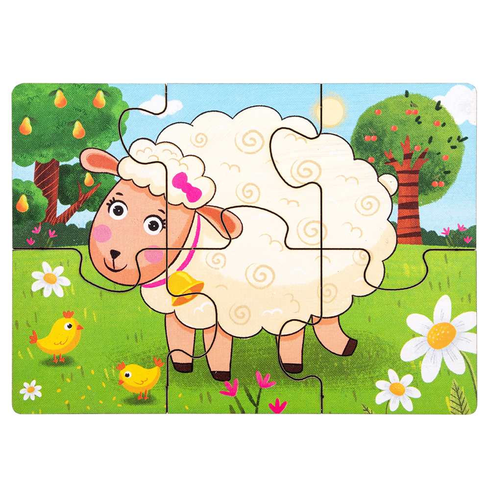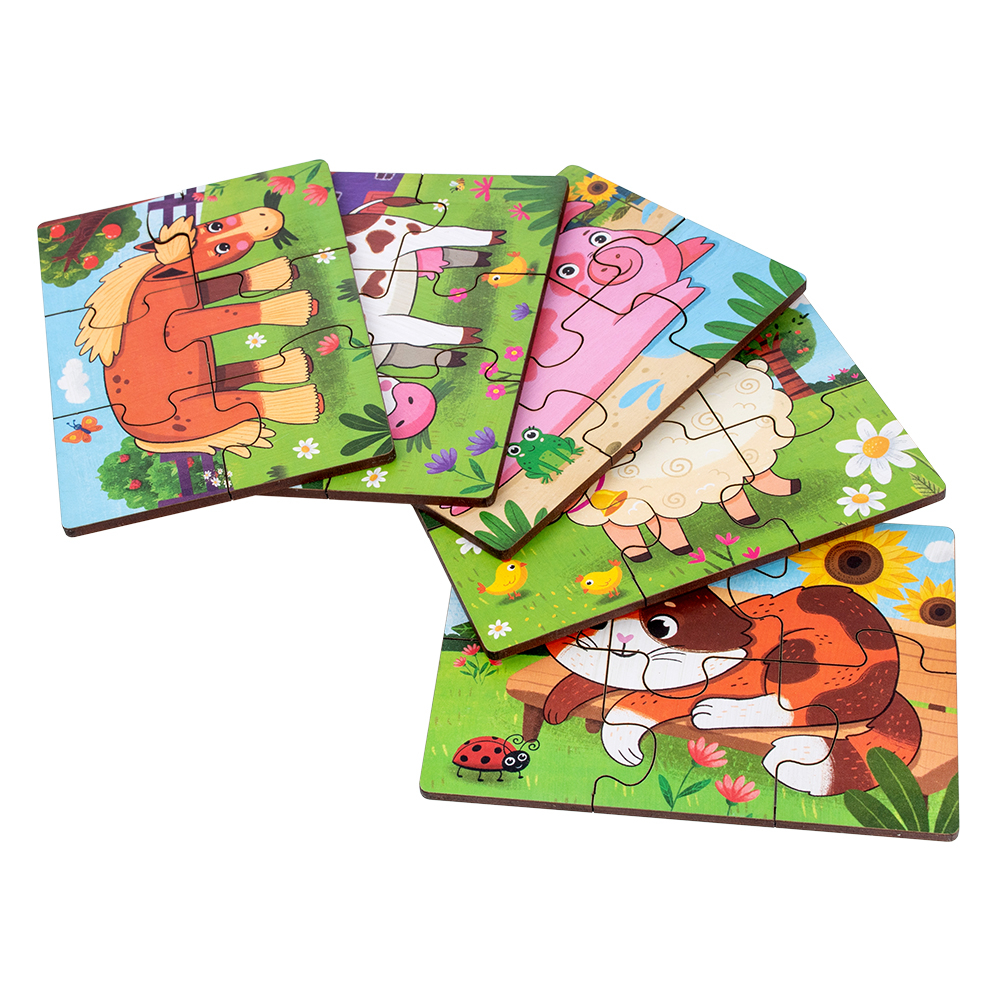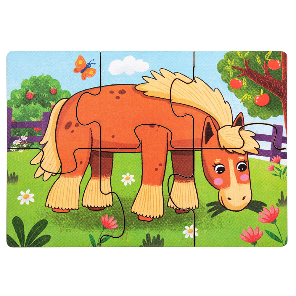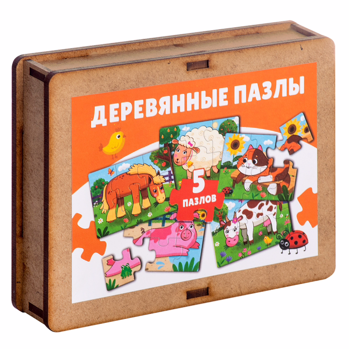 Набор из 5 пазлов с изображениями домашних животных. Каждый пазл состоит из 6 крупных деталей, удобных для сборки даже для маленького ребенка.