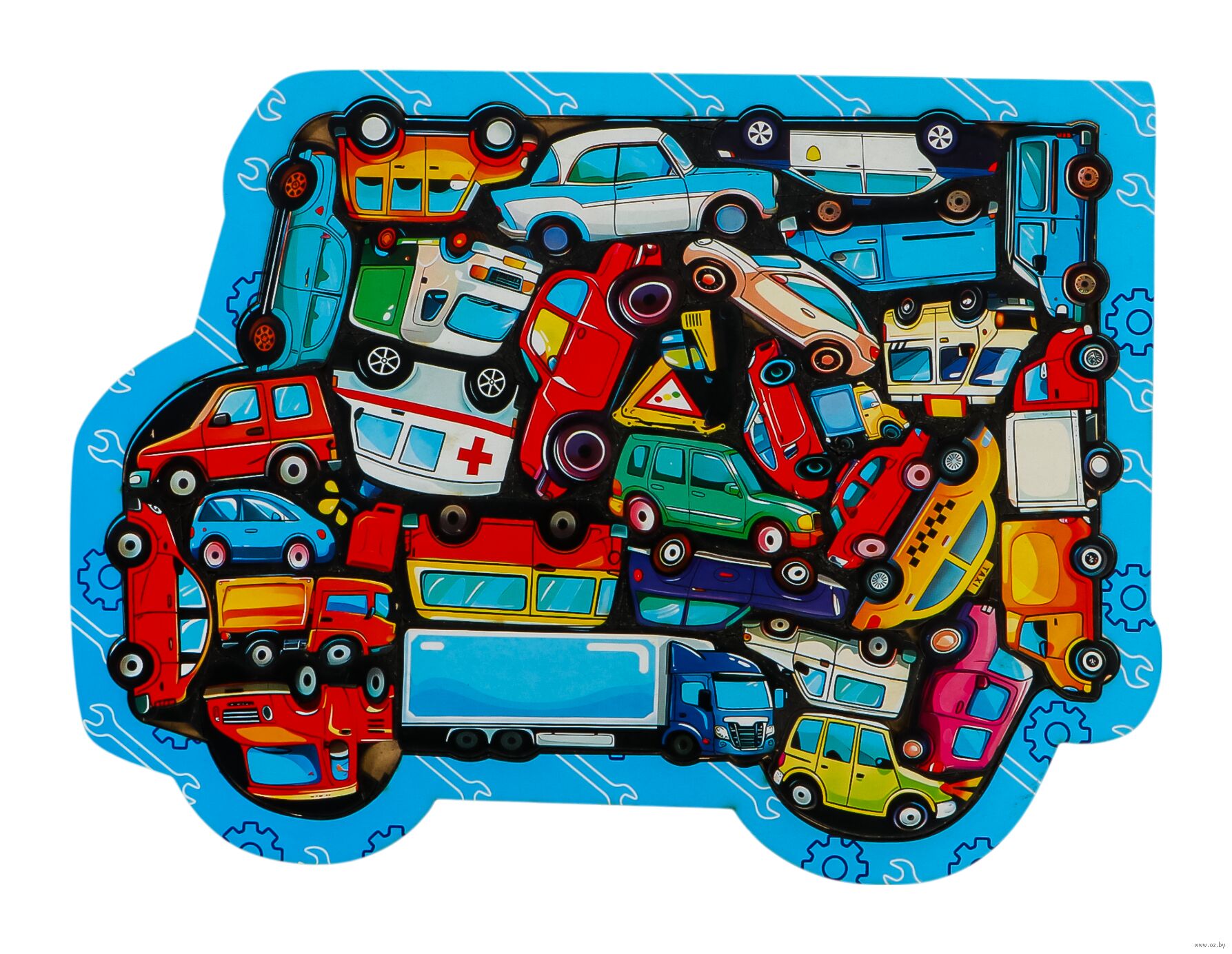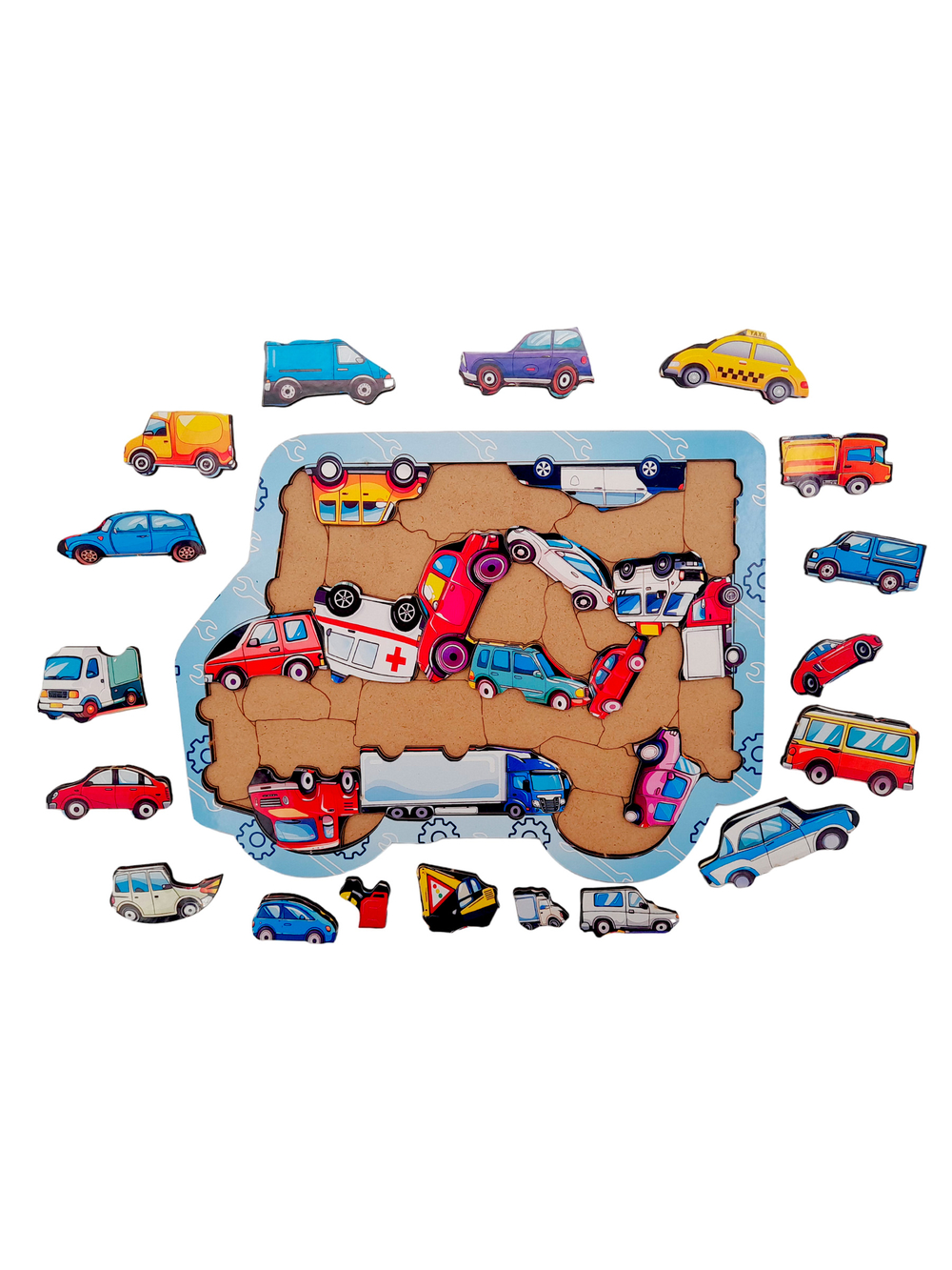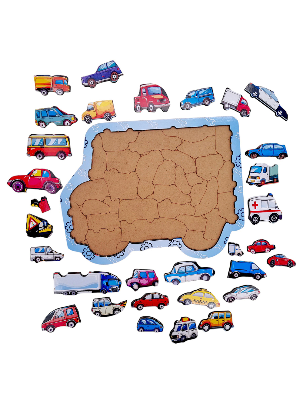 Это фигурный деревянный пазл, выполненный в формате сортера. Это значит, что у него уже есть рамка и подложка, что облегчит процесс сборки укрупнённых деталей.