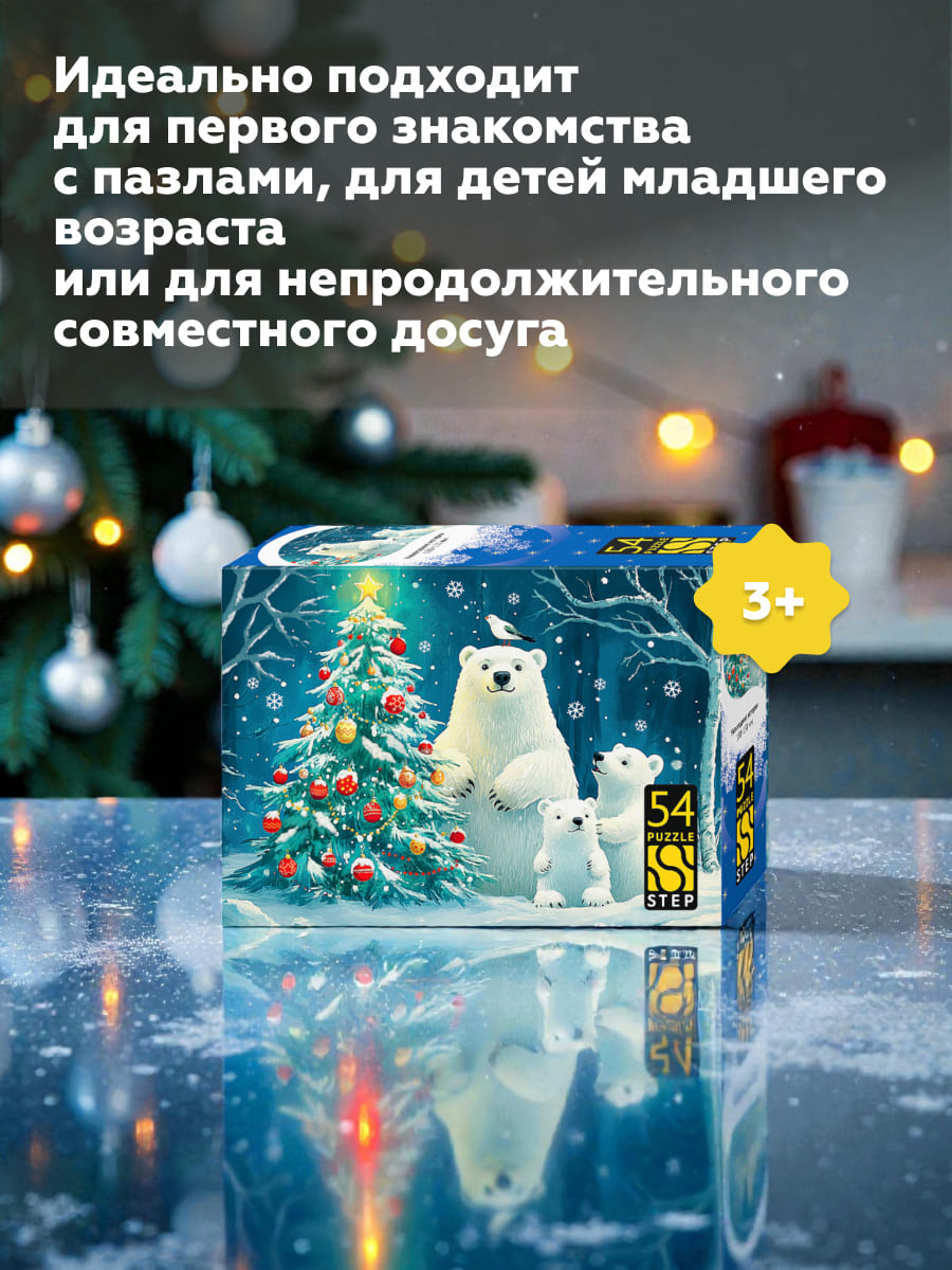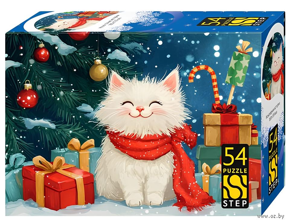 Пазл на 54 детали – это маленькое чудо с зимним настроением. Собранная картинка размером 180х130 мм представляет разные праздничные сюжеты: уютный пряничный городок, любопытного котёнка, озорного щенка, доброго Деда Мороза с оленем и весёлых белых медвежат.