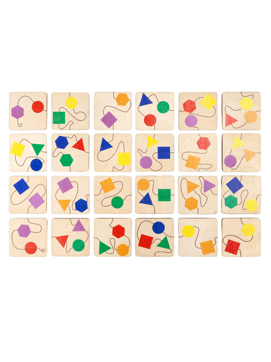 Деревянный пазл для детей "Гирлянда" – интересная развивающая игра с элементами из древесного материала (экологичной березовой фанеры). На фишках изображены разноцветные геометрические фигуры, соединенные между собой "веревочками". Соединяйте "веревочки", подбирая фигуры по цвету или по форме.