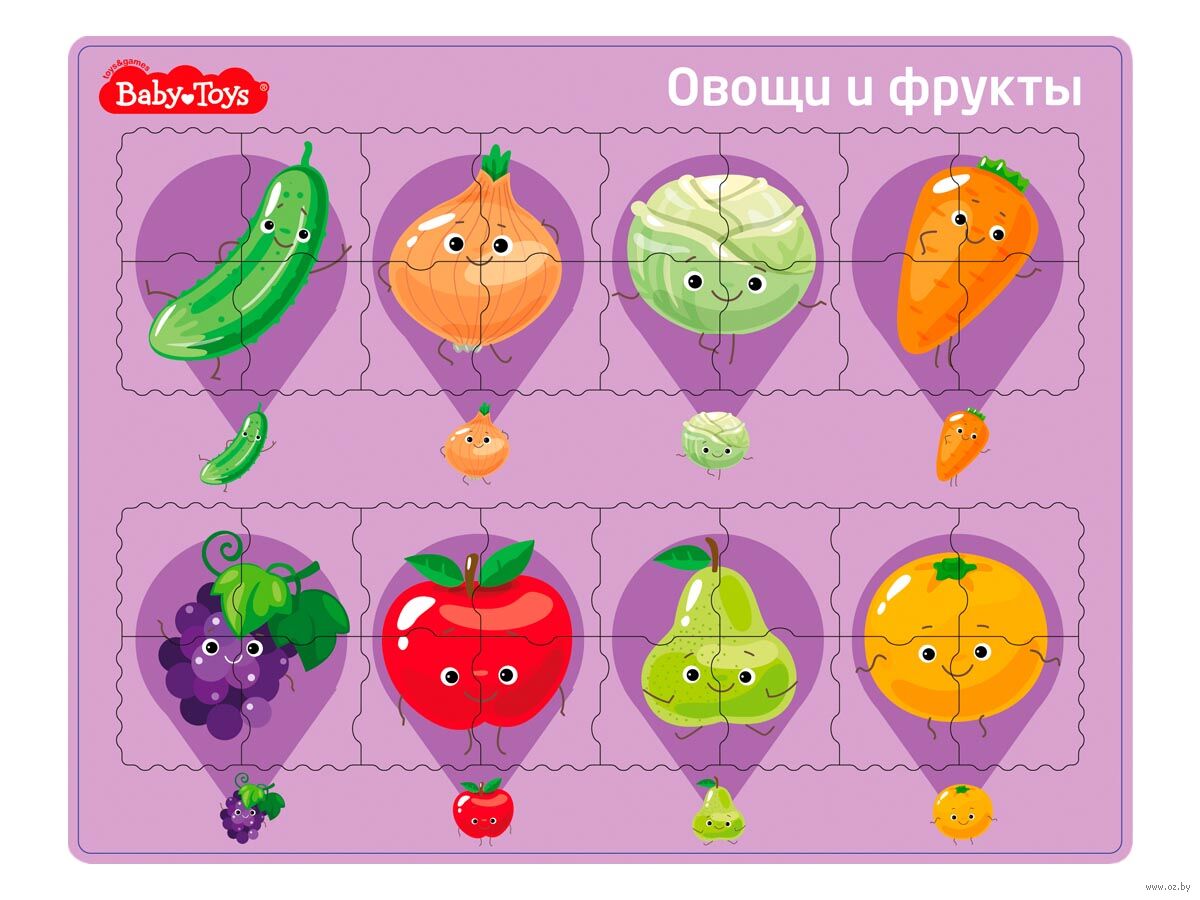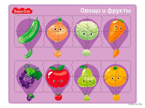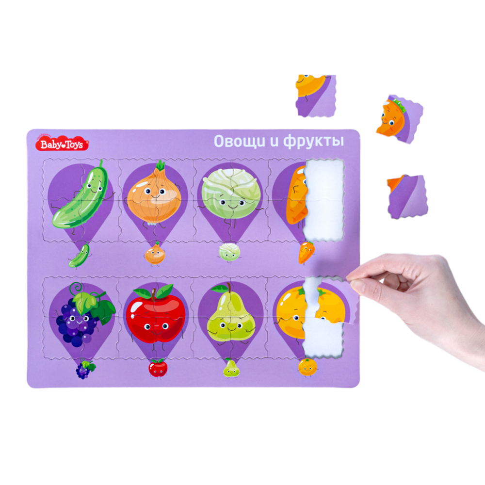 Планшетный пазл для детей "Овощи и фрукты" – это большой пазл из плотного картона, который собирается на специальном основании. На игровом поле изображены яркие картинки-подсказки.