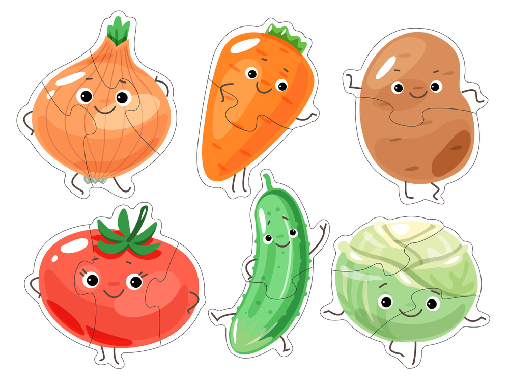 В состав игры пазлы-контуры для малышей "Овощи" входят изображения лука, помидора, моркови, огурца, капусты и картошки.