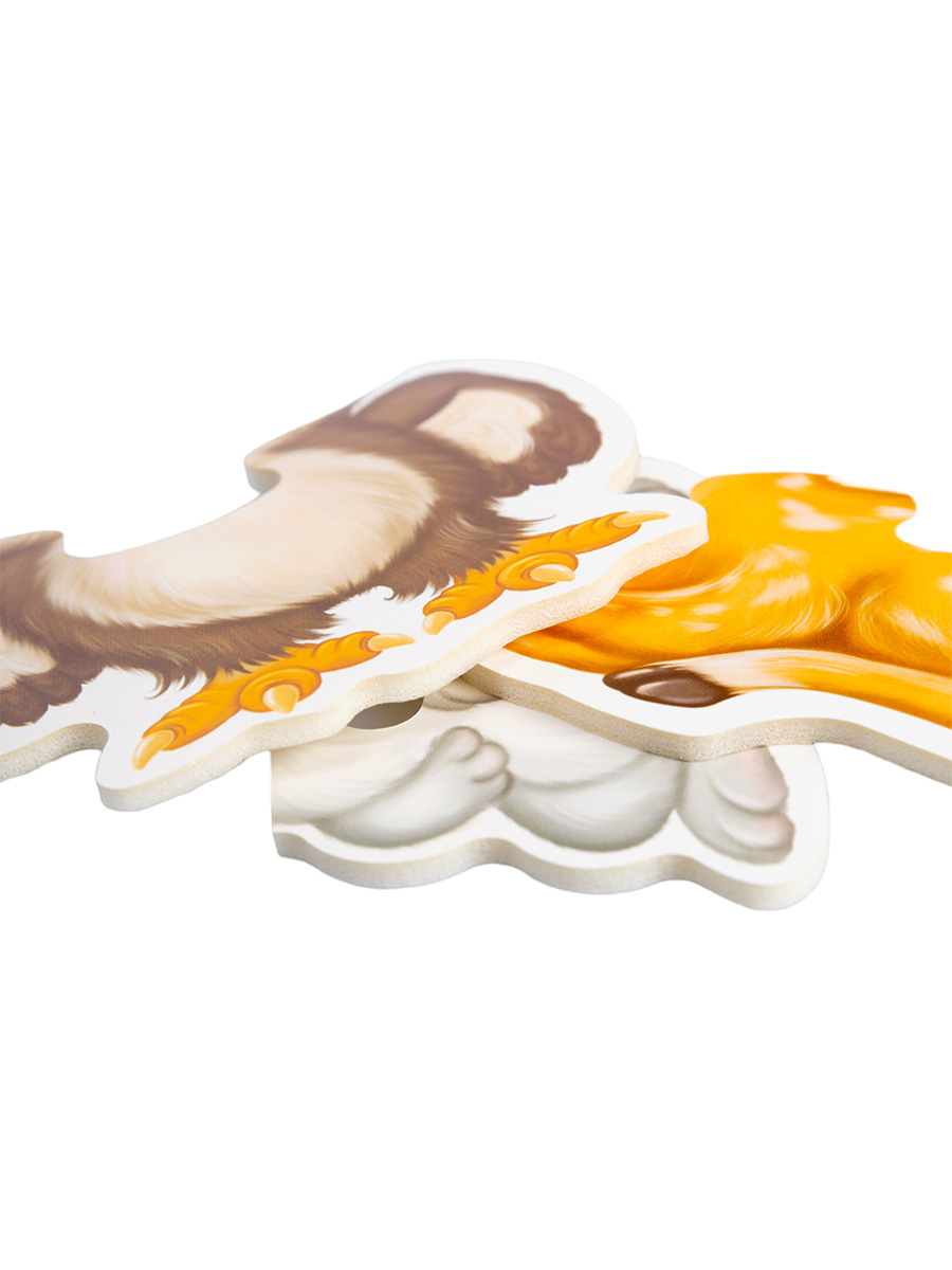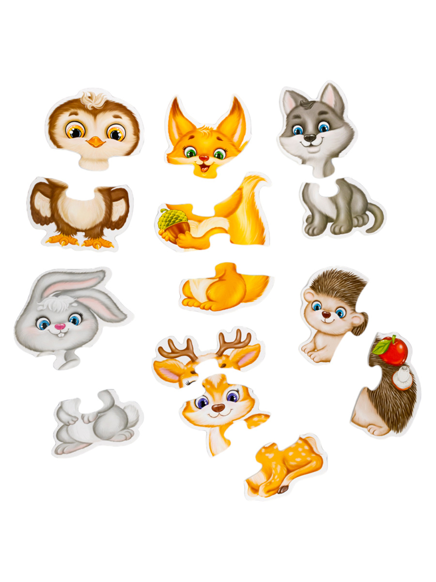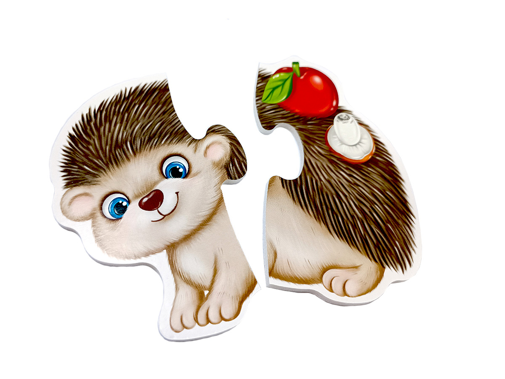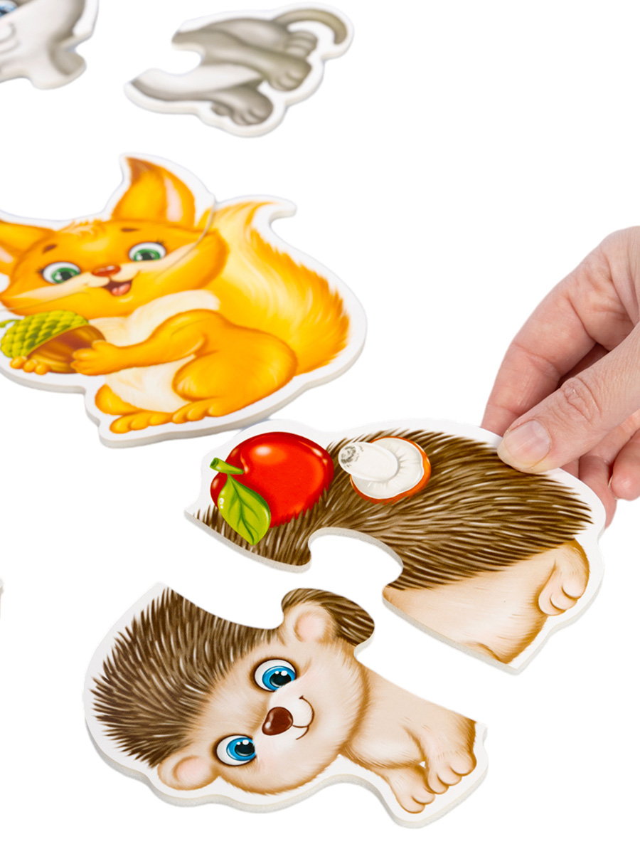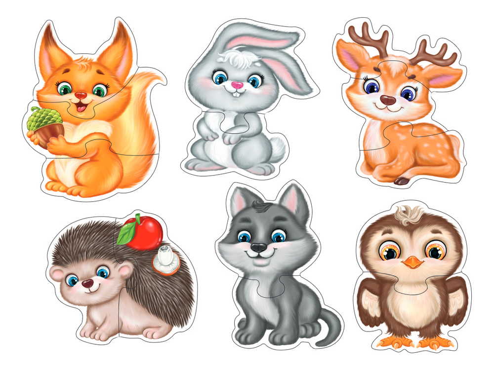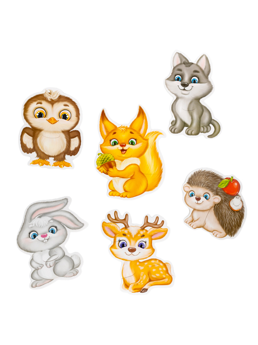 В состав игры пазлы-контуры для малышей "Первые пазлы" входят изображения ёжика, зайчика, совёнка, оленёнка, белочки и волчёнка.