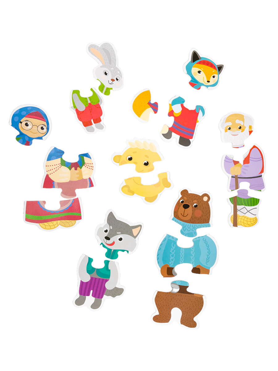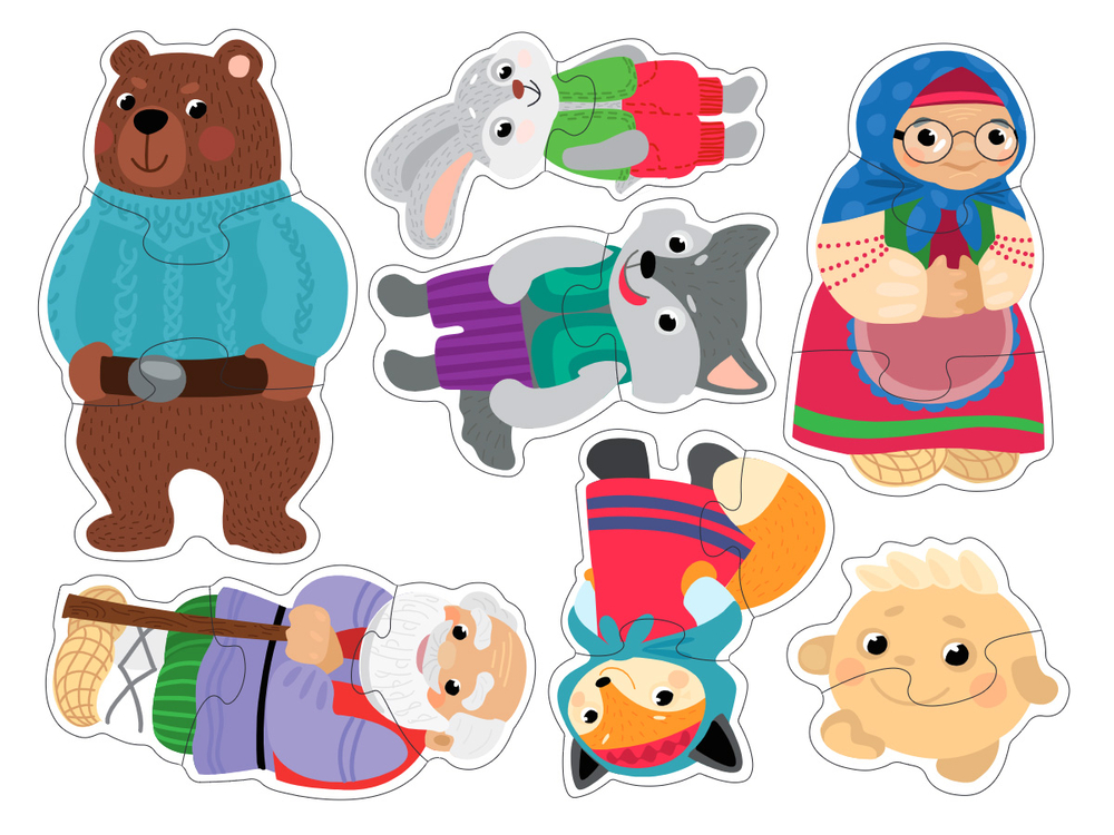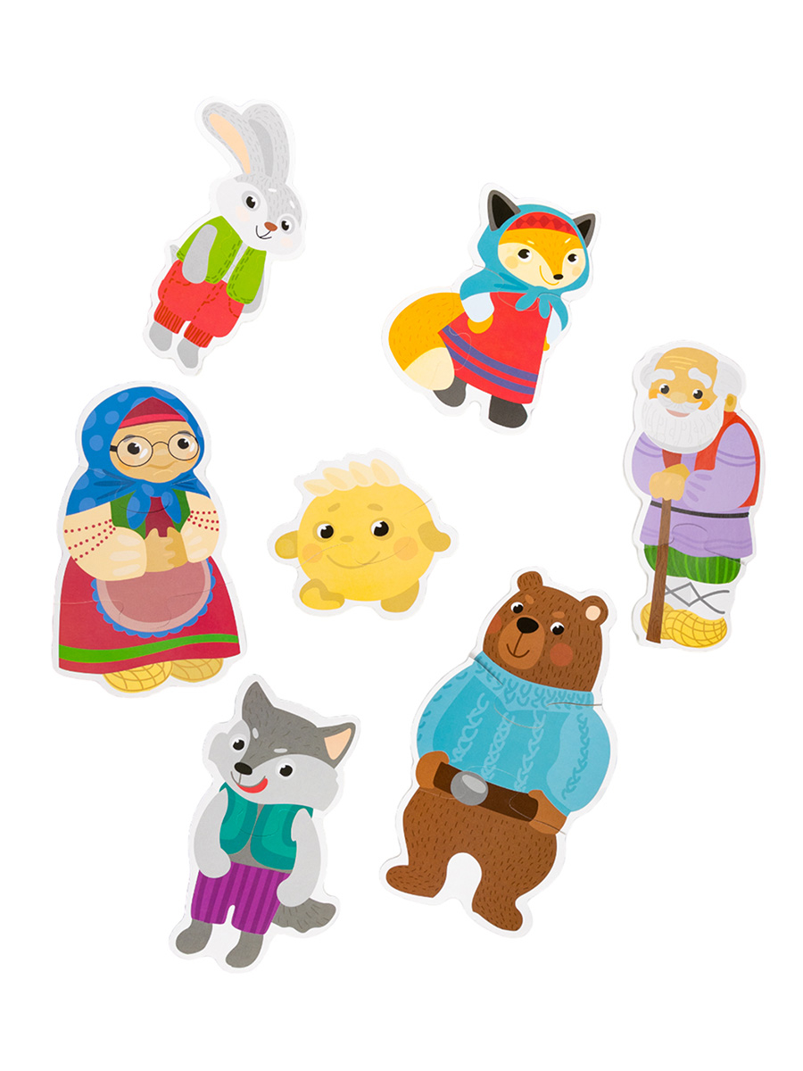 В состав игры пазлы-контуры для малышей "Колобок" входят изображения персонажей русской-народной сказки: колобок, дед, бабушка, лиса, волк, заяц, медведь.