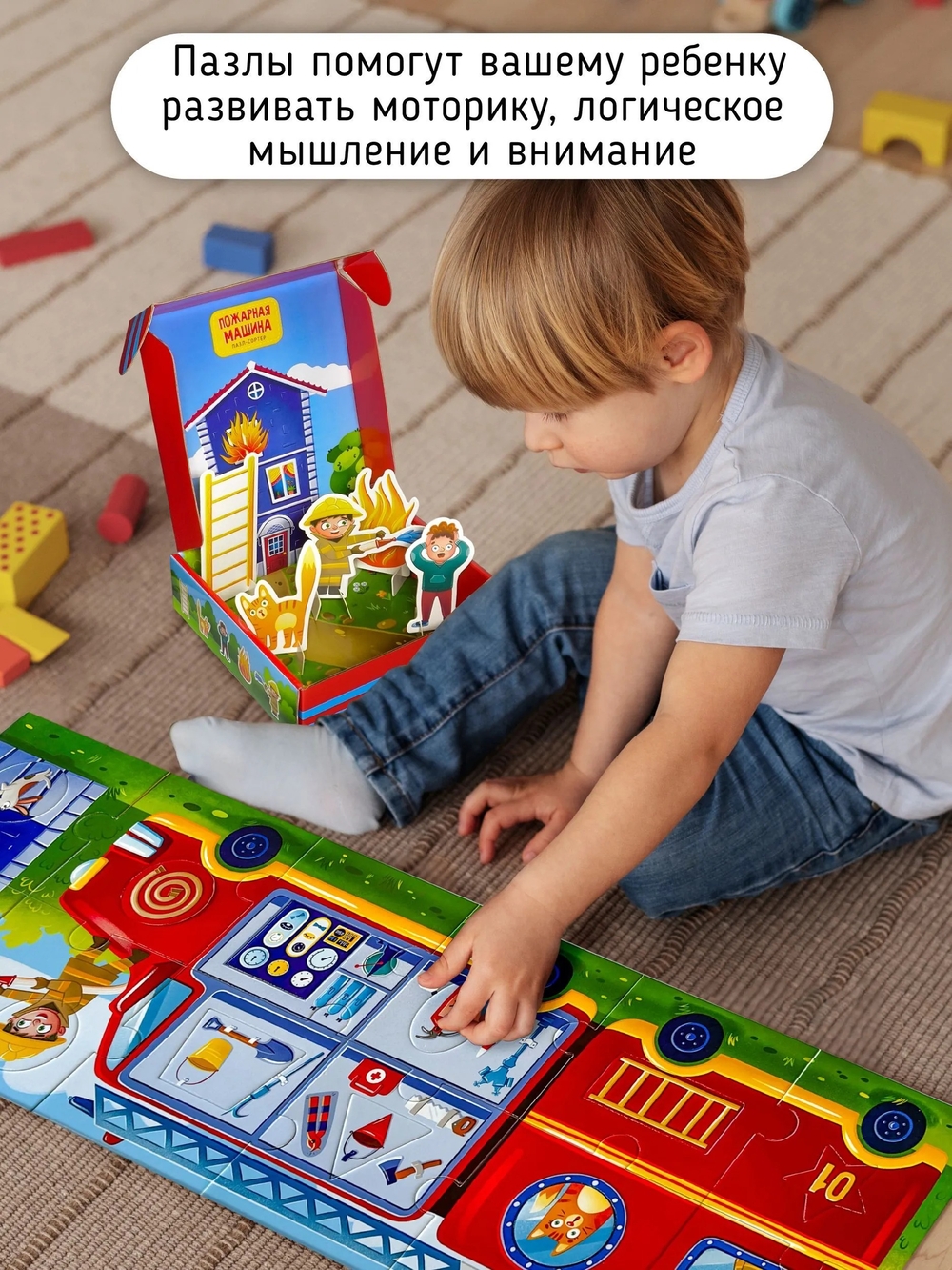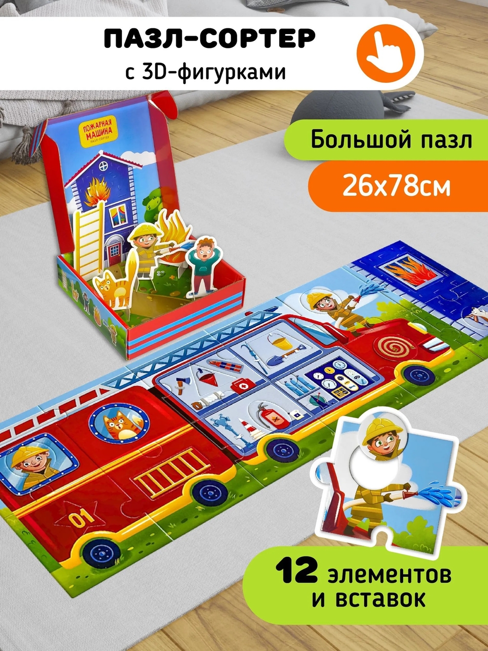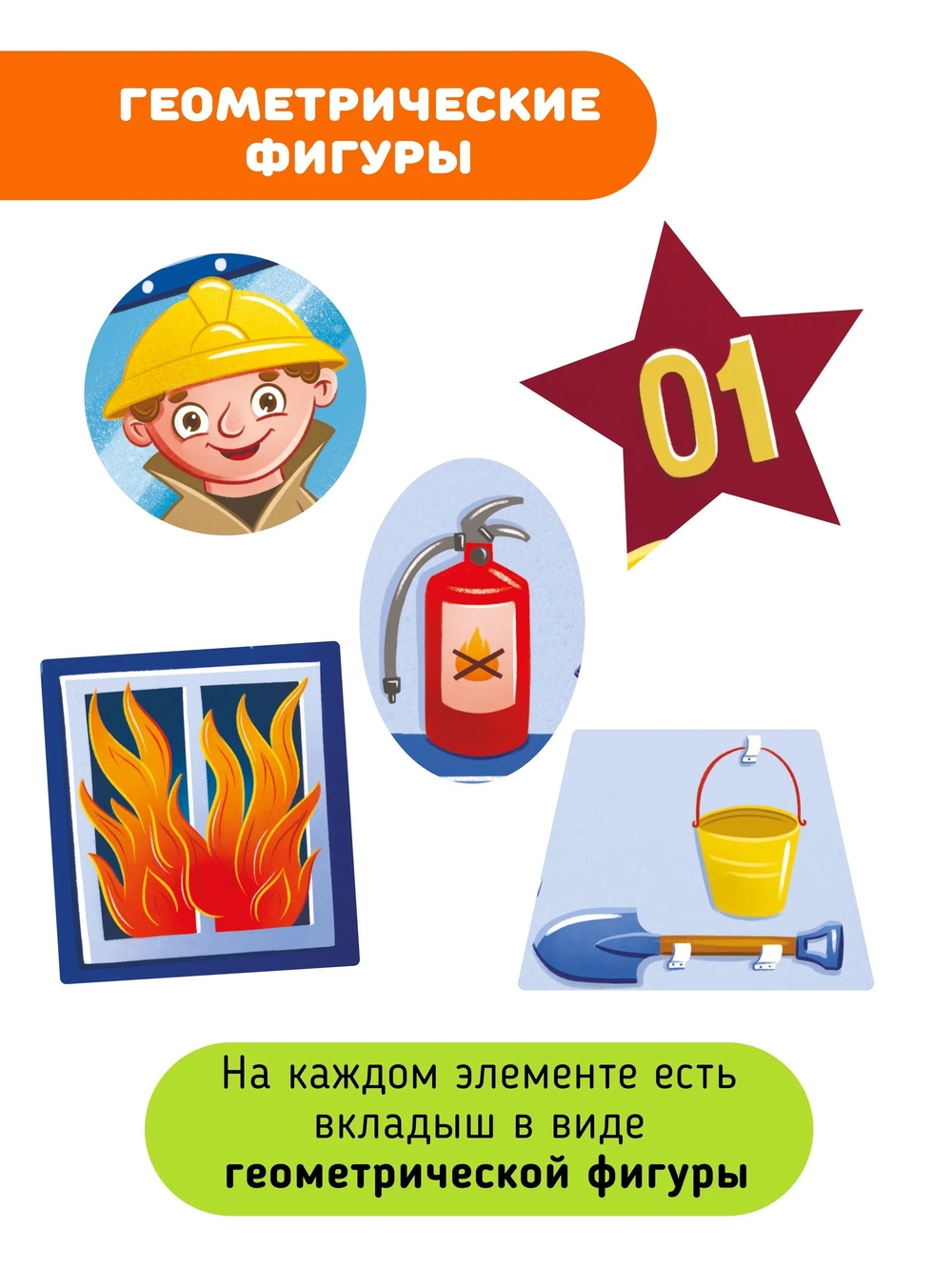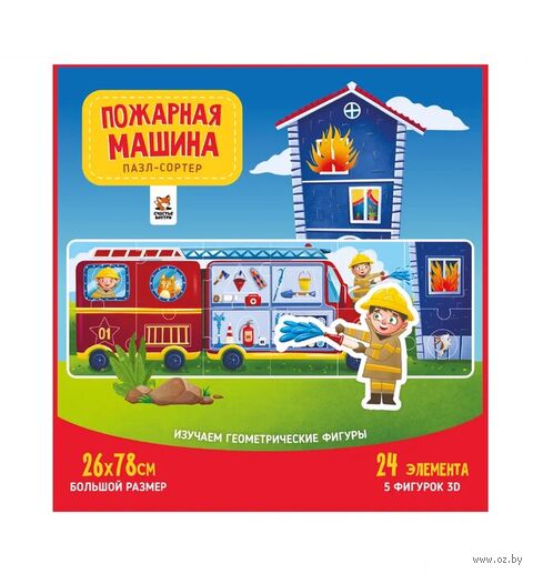 Он состоит из 12 крупных деталей (размер каждой 13х13 см) из плотного картона. На каждом элементе есть вкладыш в виде геометрической фигуры. Складывая картинку с изображением большой пожарной машины, кроха будет запоминать названия основных форм и узнает особенности профессии пожарный. После сборки можно поиграть в найди и покажи, подобно книге Виммельбуху, что делает его еще более занимательным.