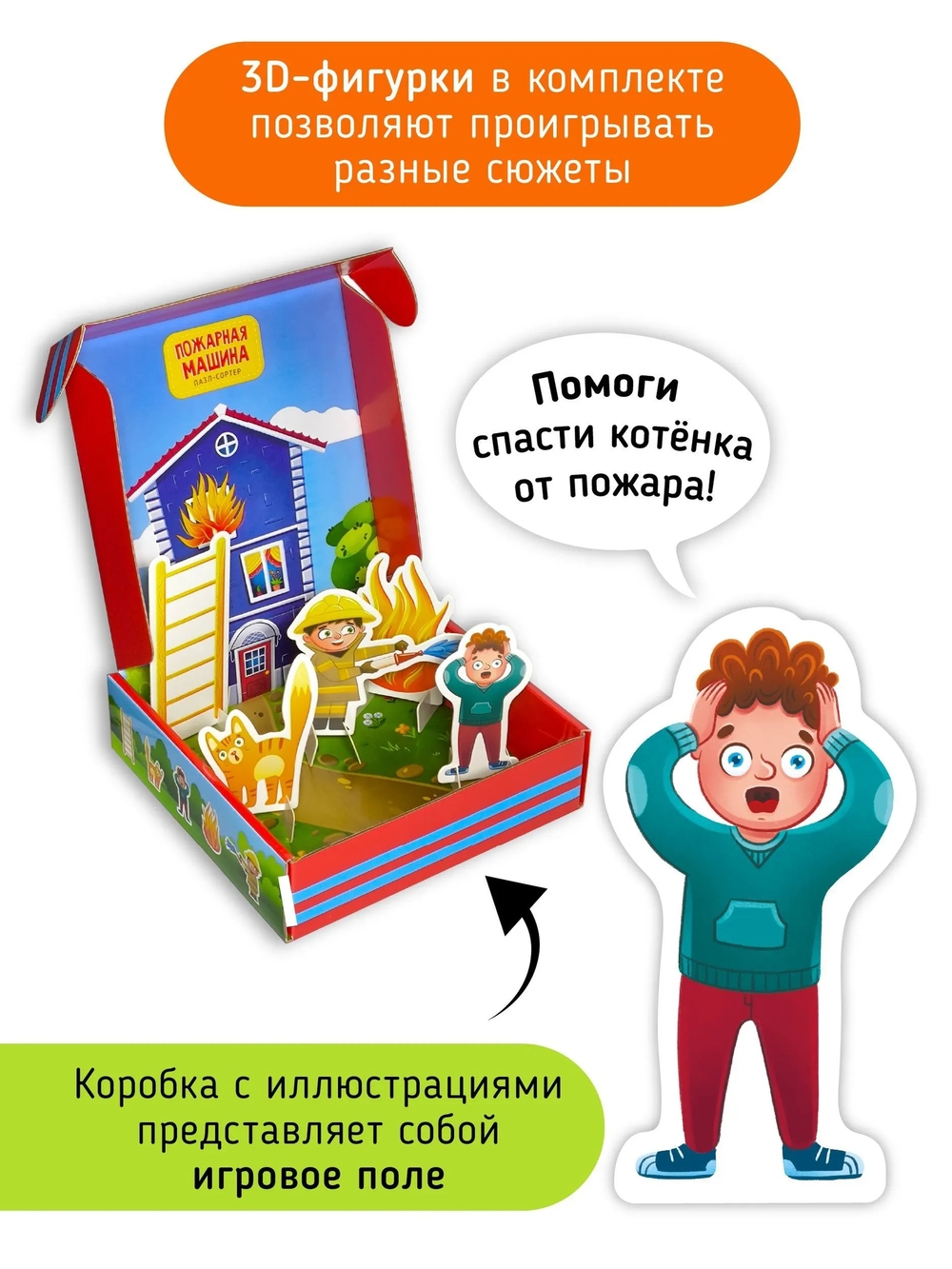В игровом наборе также есть пять фигурок 3D, которые можно использовать для совместных занятий. Дети смогут не только собирать, но и играть, развивая тактильные навыки, воображение и моторику рук по методике Монтессори. Такая игрушка даёт возможность фантазировать и сочинять разные истории для активного развития речи и расширения словарного запаса девочек и мальчиков. На обратной стороне находится дорога для машинок.