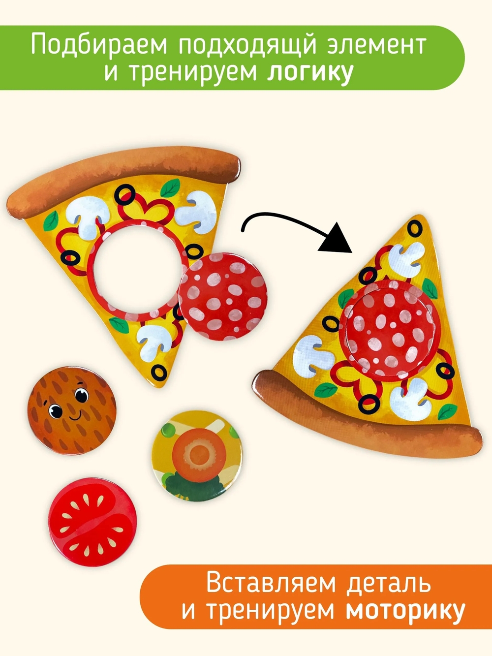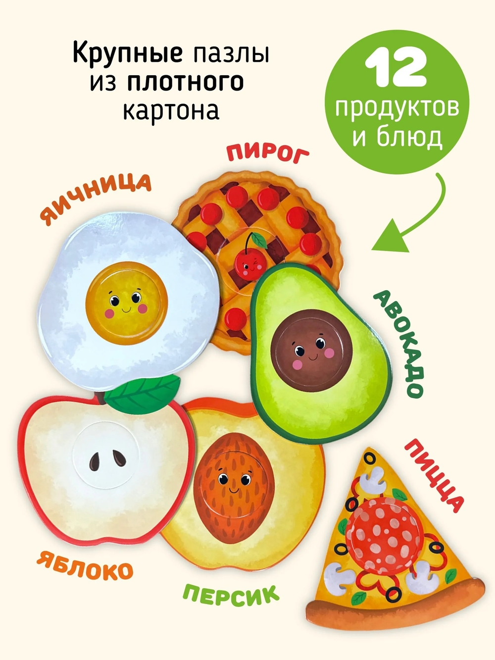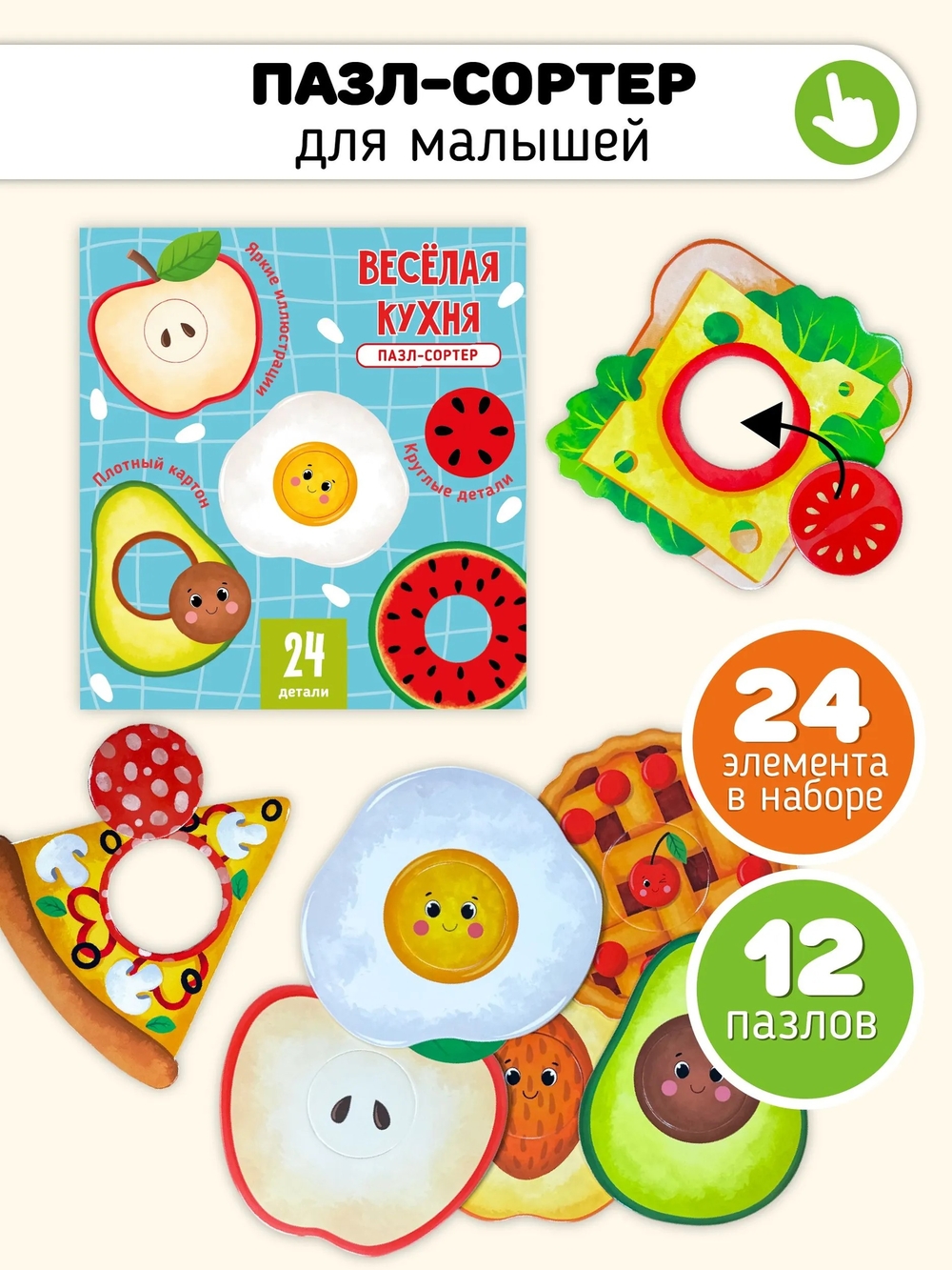 12 карточек и 24 элемента: большие детали 15х15 см. Яблоко, авокадо, бутерброд, пицца, салат, апельсин, яичница и другие.