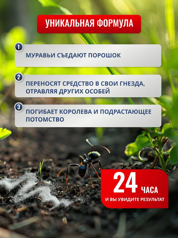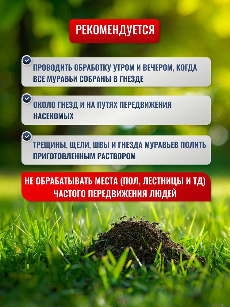 Средство рекомендуется применять утром или вечером, когда все муравьи собраны в гнезде. При контакте с обработанной поверхностью насекомые погибают через 24 часа.
