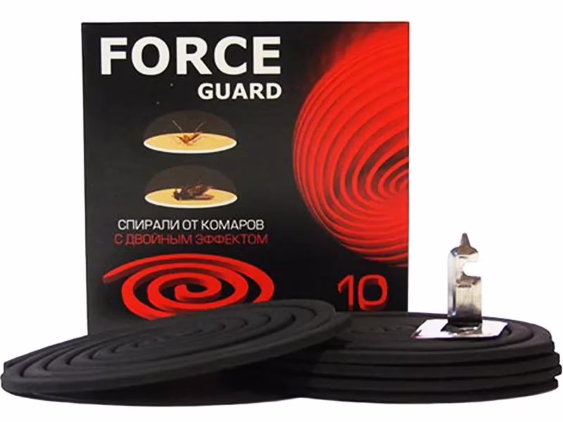 Спирали от комаров Force Guard с двойным эффектом. Тлеющую спираль разместить на невоспламеняющейся поверхности на расстоянии 1 м от людей, спираль начинает действовать через 10-15 минут после начала тления, одна спираль рассчитана на 10 часов непрерывной работы, рекомендуется использовать на открытом воздухе или хорошо проветриваемом помещении.