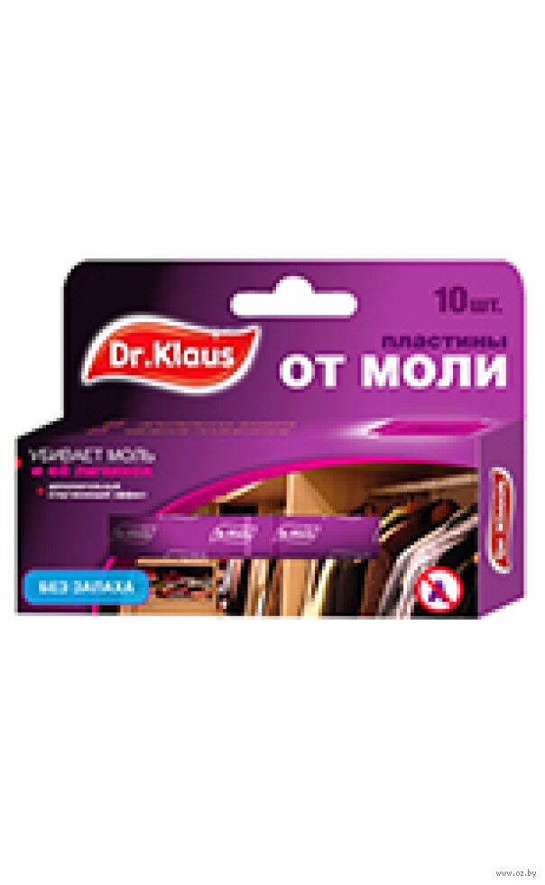 Dr.Klaus эффективно и безопасно защищает ваши вещи от моли и её личинок. Просто извлеките пластины из упаковки и разместите в шкафу не менее 10 пластин, в зависимости от его размера.
