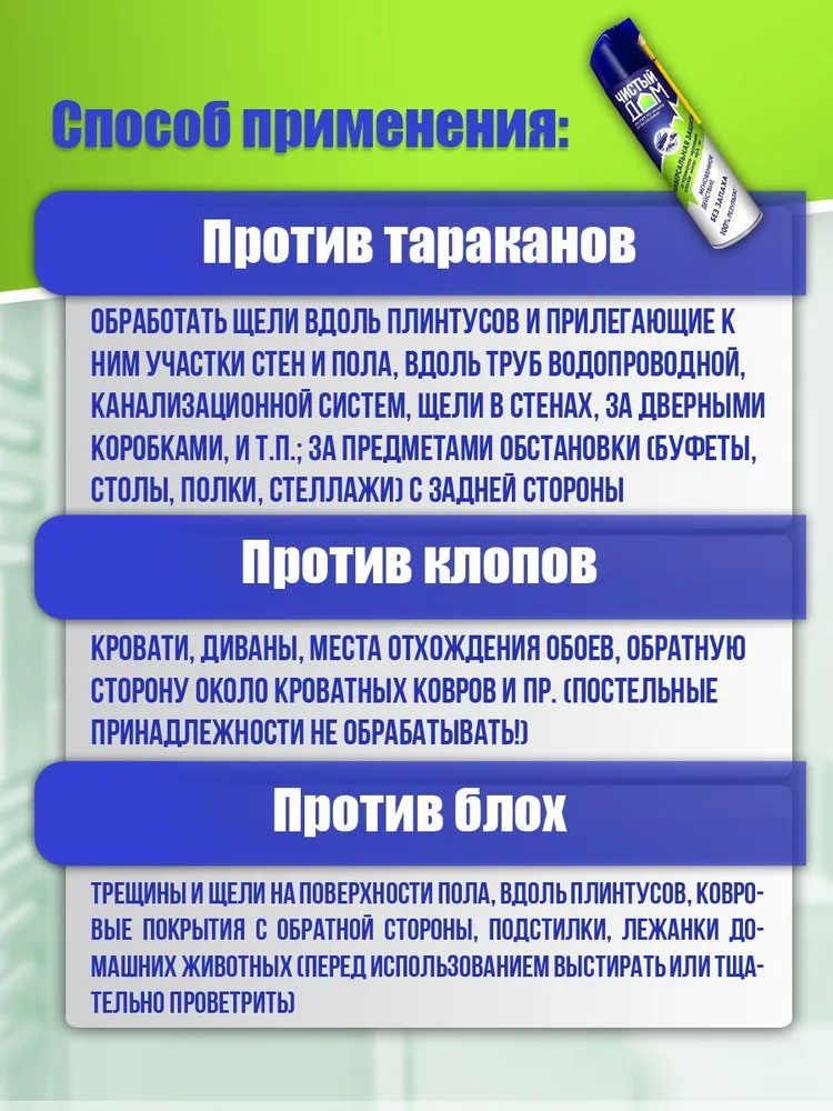 Указания по применению: Перед применением встряхнуть баллон. Для уничтожения тараканов, постельных клопов, муравьёв обработайте щели вдоль плинтусов и прилегающие к ним участки стен и пола, вдоль труб водопроводной и канализационной систем, щели за дверными коробками, обратную сторону картин, ковров, мебели, а также места передвижения насекомых; для мух – обработать места их посадки.