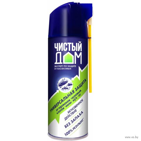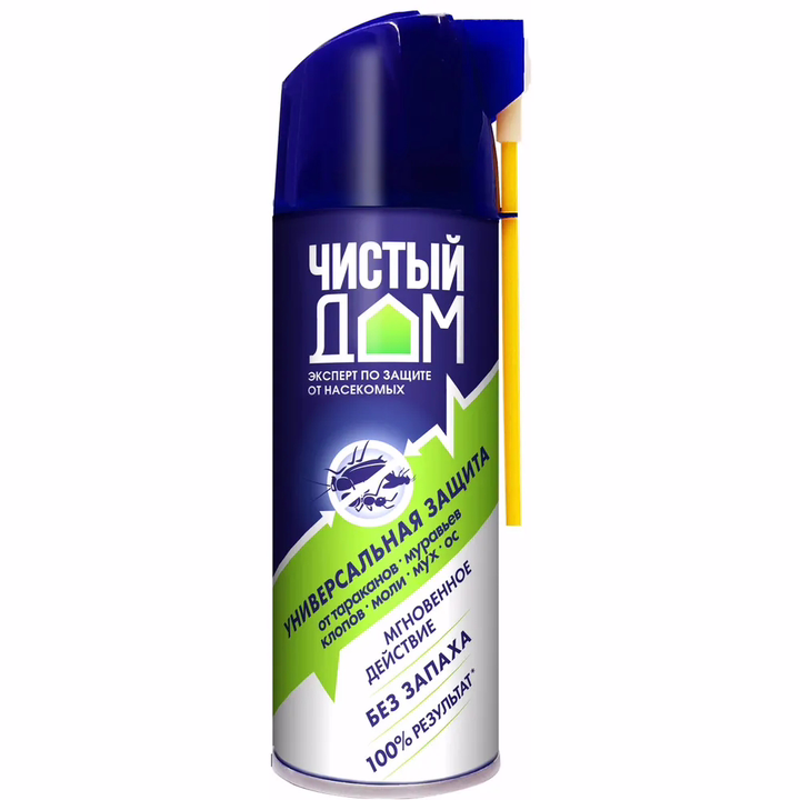 Препарат мгновенного действия, уничтожает все виды ползающих и летающих насекомых. Не оставляет пятен на коврах и мебели. Распыляющая головка двойного действия: обычное распыление и трубка для труднодоступных мест.