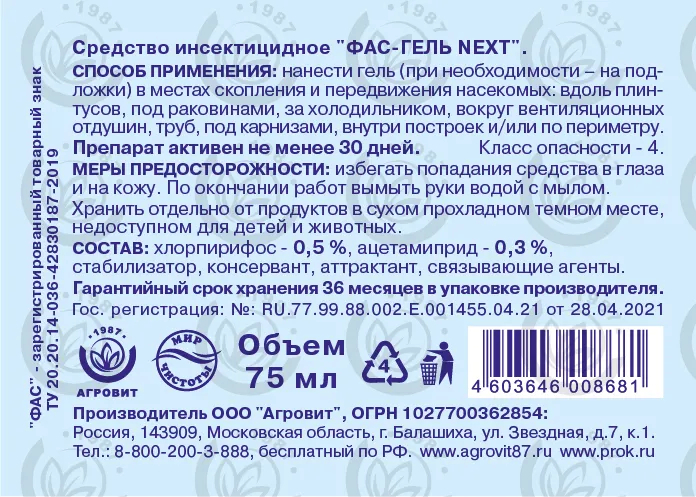 Средство представляет собой готовую к применению пищевую приманку в форме окрашенного геля голубого цвета для уничтожения: тараканов, мух, ос, уховерток, сверчков, мокриц, чешуйниц и др.