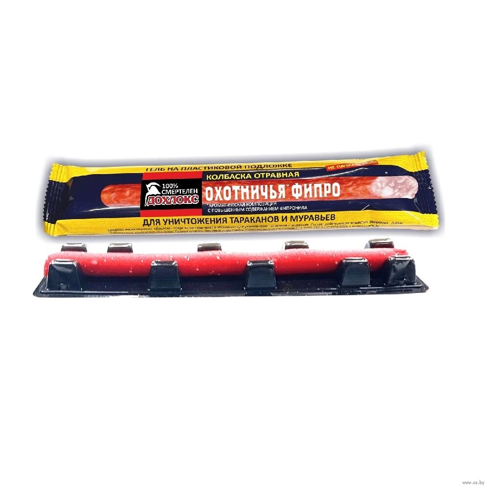 Отравная колбаска Охотничья Фипро содержит в составе мощное отравляющее вещество – фипронил в существенно повышенном количестве. Гель размещен на пластиковой подложке, что позволяет при использовании сохранять пол и другие поверхности чистыми.
