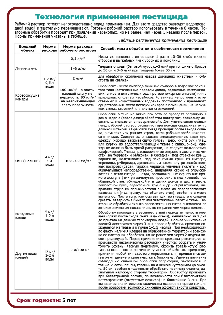 Препарат эффективен против вредителей, опасных для человека. Длительное время сохраняет эффективность на обработанных поверхностях. Прекрасно работает в жару, устойчив к смыванию водой.
