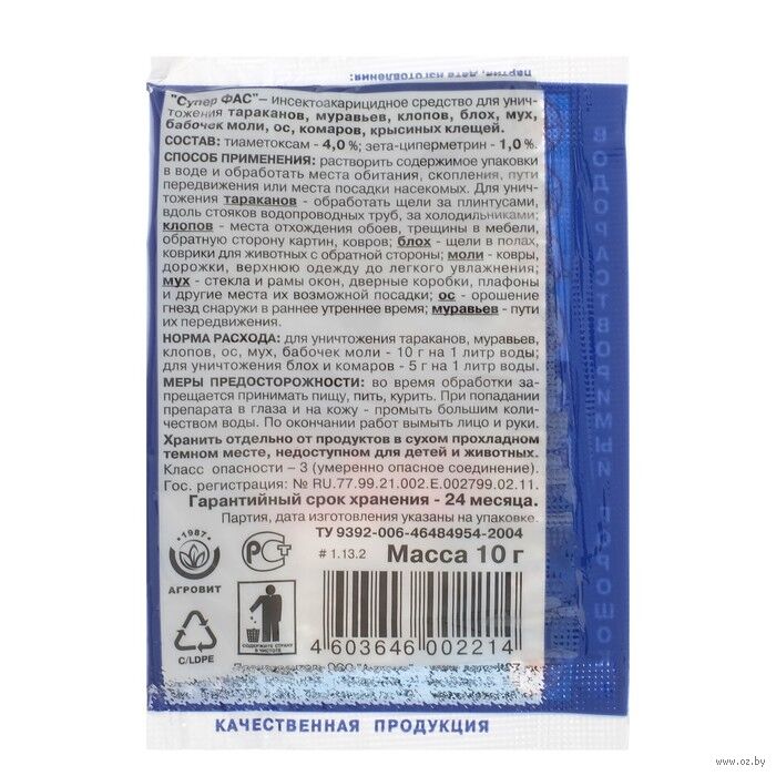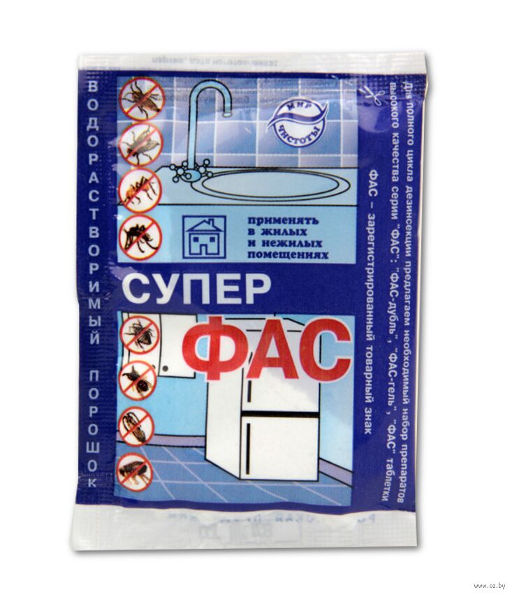 Инсектицидное средство Супер ФАС – это водорастворимый порошок светло-серого цвета. Средство обладает острым инсектоакарицидным действием (остаточная активность до 6 недель) для уничтожения насекомых: тараканов, муравьев, клопов, блох, ос, мух, комаров, крысиных клещей, бабочек моли.