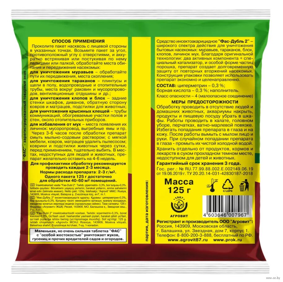 Инсектицидное средство Фас-дубль 2 представляет собой порошок от белого до серого цвета. Удобная упаковка (пакет-опыливатель) позволяет использовать препарат экономно и эффективно.