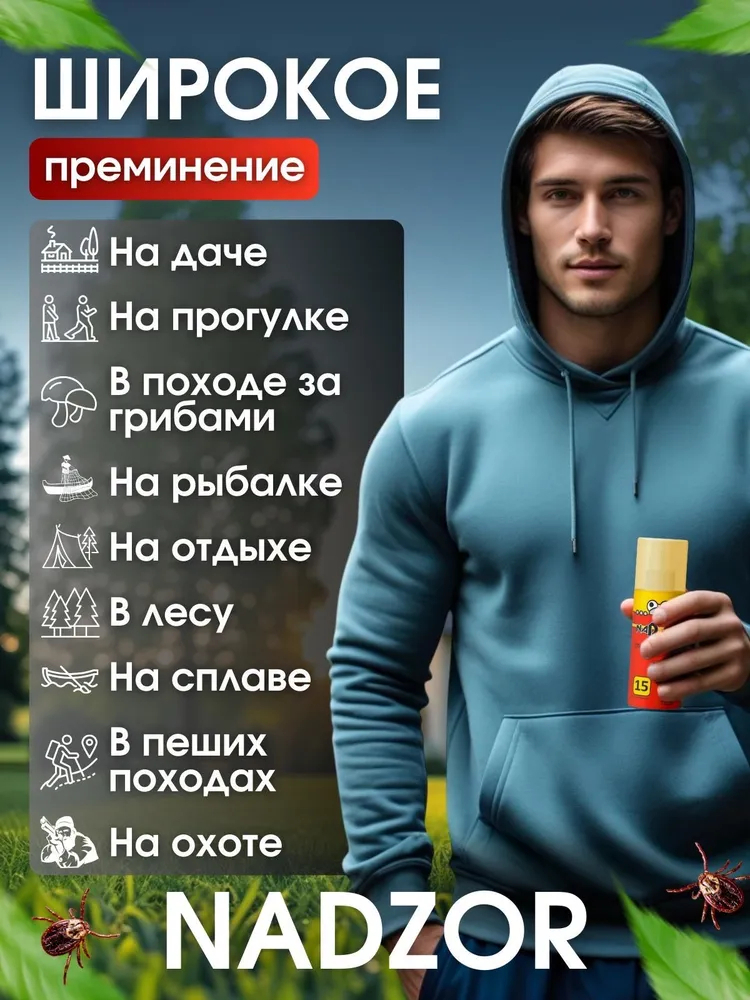 Спрей обладает защитным эффектом длительного действия и обеспечивает надежную защиту людей от нападения иксодовых клещей (таёжных и лесных клещей), а также летающих кровососущих насекомых (комаров, мокрецов, москитов) и блох при нанесении на одежду комаров, мошек, слепней, мокрецов и москитов. Время защитного действия – до 15 суток.