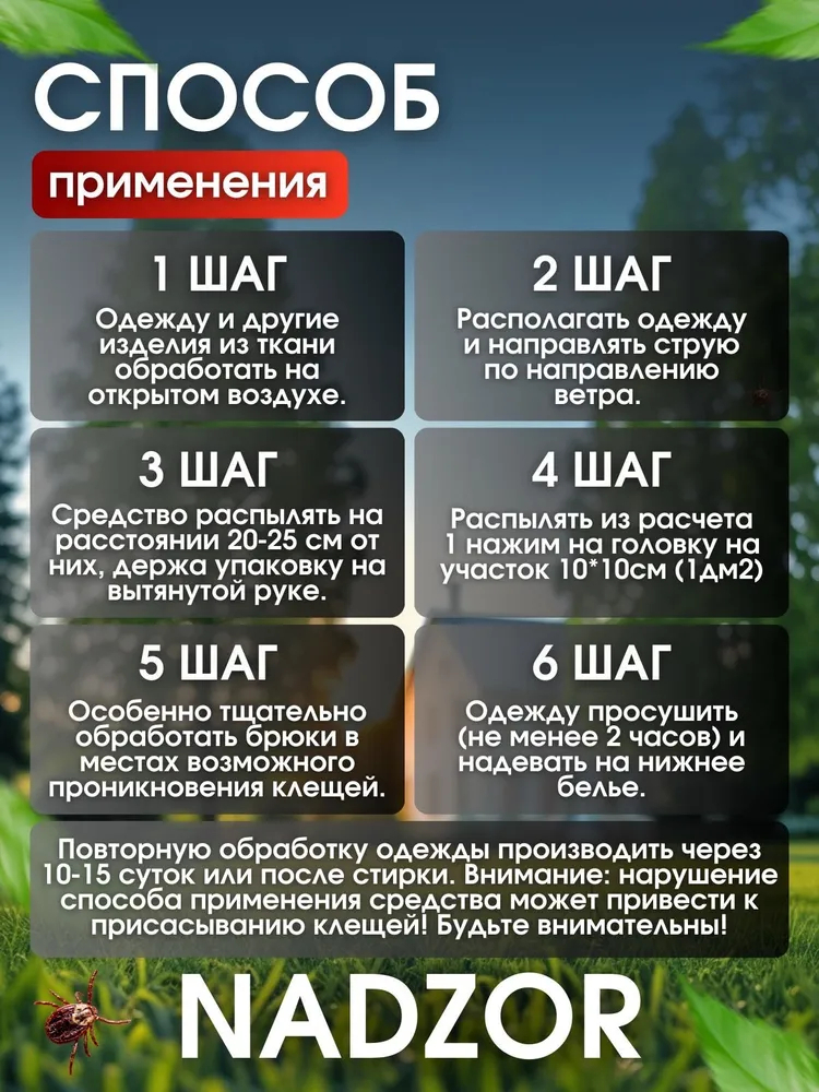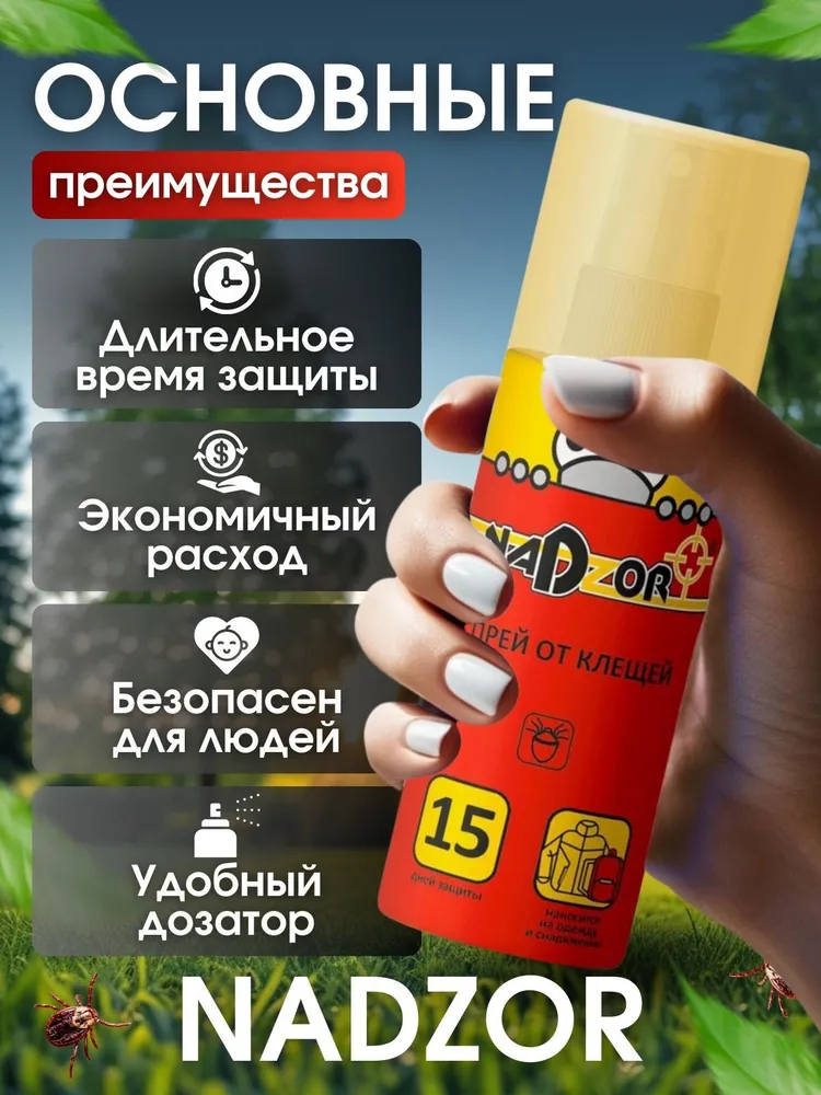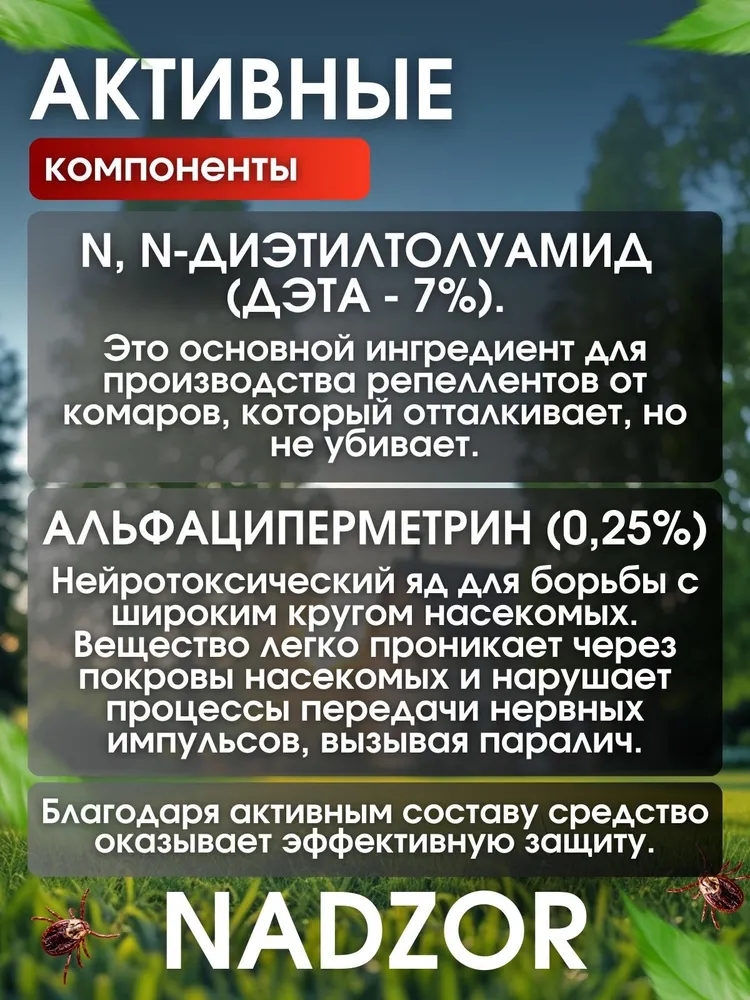 Средство обладает широким спектром инсектоакарицидного действия в отношении вредоносных насекомых. При распылении спрея от клещей Nadzor молекулы действующего вещества начинают постепенно проникать в структуру ткани одежды. В составе спрея инсектициды защитного и искореняющего, контактного и кишечного действия, которые попадают через дыхательные пути насекомого, его хитиновый покров и пищеварительную систему. Уже после высыхания обработанной одежды действующее вещество начинает своё воздействие на насекомых и достигается эффект от использования средства.