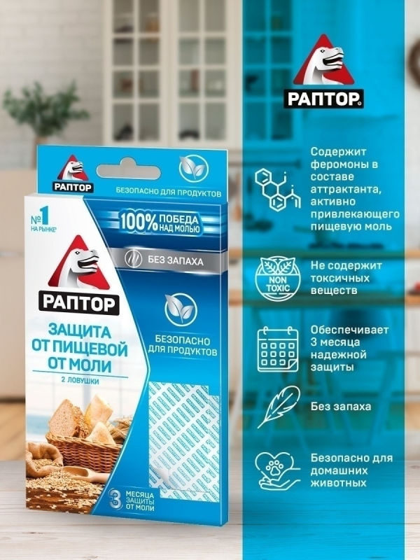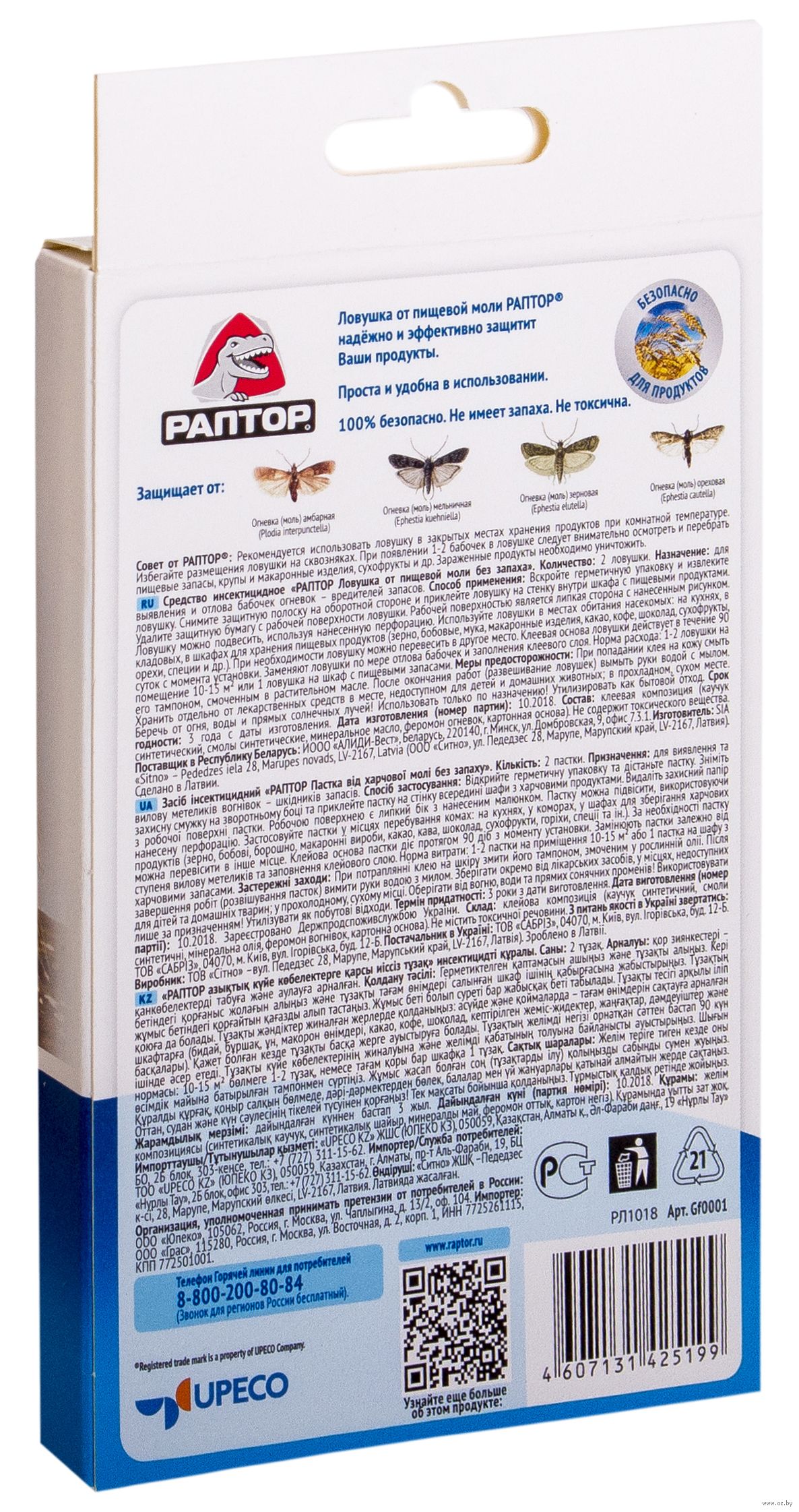 средство хорошее - работает. к утру уже налипли в количестве 5 штук (большие и маленькие. надеюсь, что и личинки тоже уничтожает тем, что они не успевают размножаться т.к. сами личинки не налипают в ловушку) (у меня эта моль появилась не в шкафчиках с едой, а в шкафу, где хранятся всякие мелочи для хоз.нужд. пересмотр всех вещей так и не выявил источник их гнездования) в упаковке 2 пластинки абсолютно без запаха, которые можно разрезать на 4. только резать нужно вдоль, а не поперек, чтобы клеящая лента попала на обе половинки. и разместить Из минусов. очень маленькая клеящая основа - просто полосочка. в связи с этим проблематично приклеить ее накрепко, потому что когда отдираешь верхнюю липкую поверхность (а отдирается она с усилием). ловушка отклеивается, а липкая поверхность прилипает к пальцам намертво, как клей, и водой не смывается. в общем, нужно приловчиться. ну и дороговато все-таки.