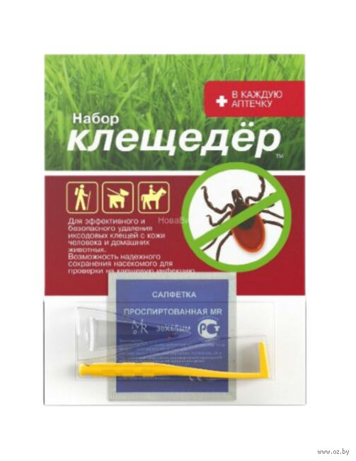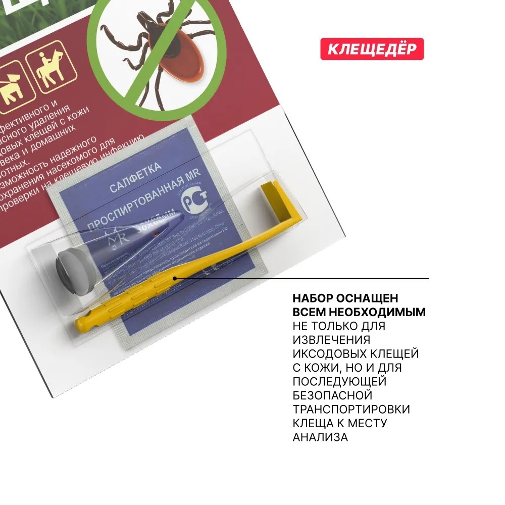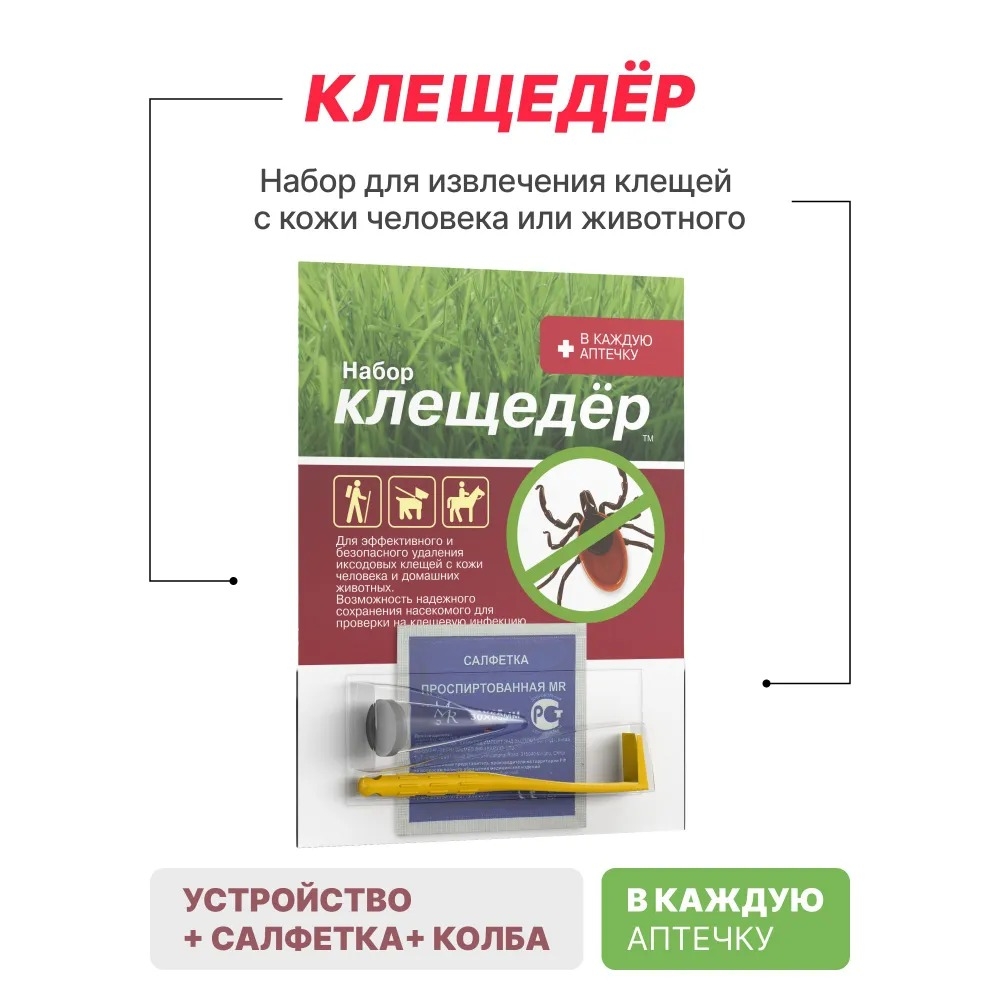 Набор состоит из трех предметов, которые обеспечивают быстрое и безболезненное удаление. Выкручиватель изготовлен из прочного и безопасного пластика, легко дезинфицируется и удобно хранится. К нему прилагается проспиртованная салфетка для обработки участка кожи после извлечения клеща, а также пробирка с крышкой для безопасной транспортировки клеща к месту анализа.