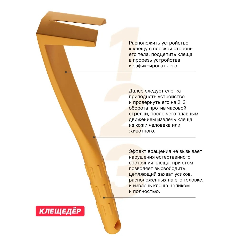 Клещедер – это надежный и удобный инструмент для безопасного извлечения клещей. Его универсальность позволяет использовать его как для людей, так и для животных, а также для клещей любого размера и в любом месте укуса.