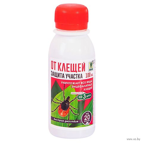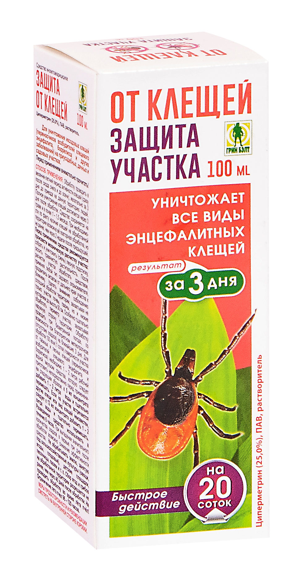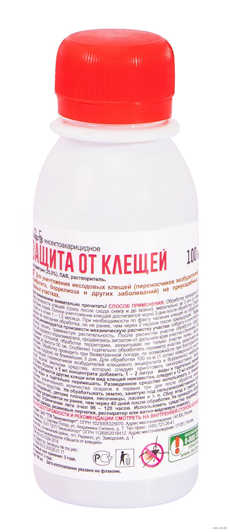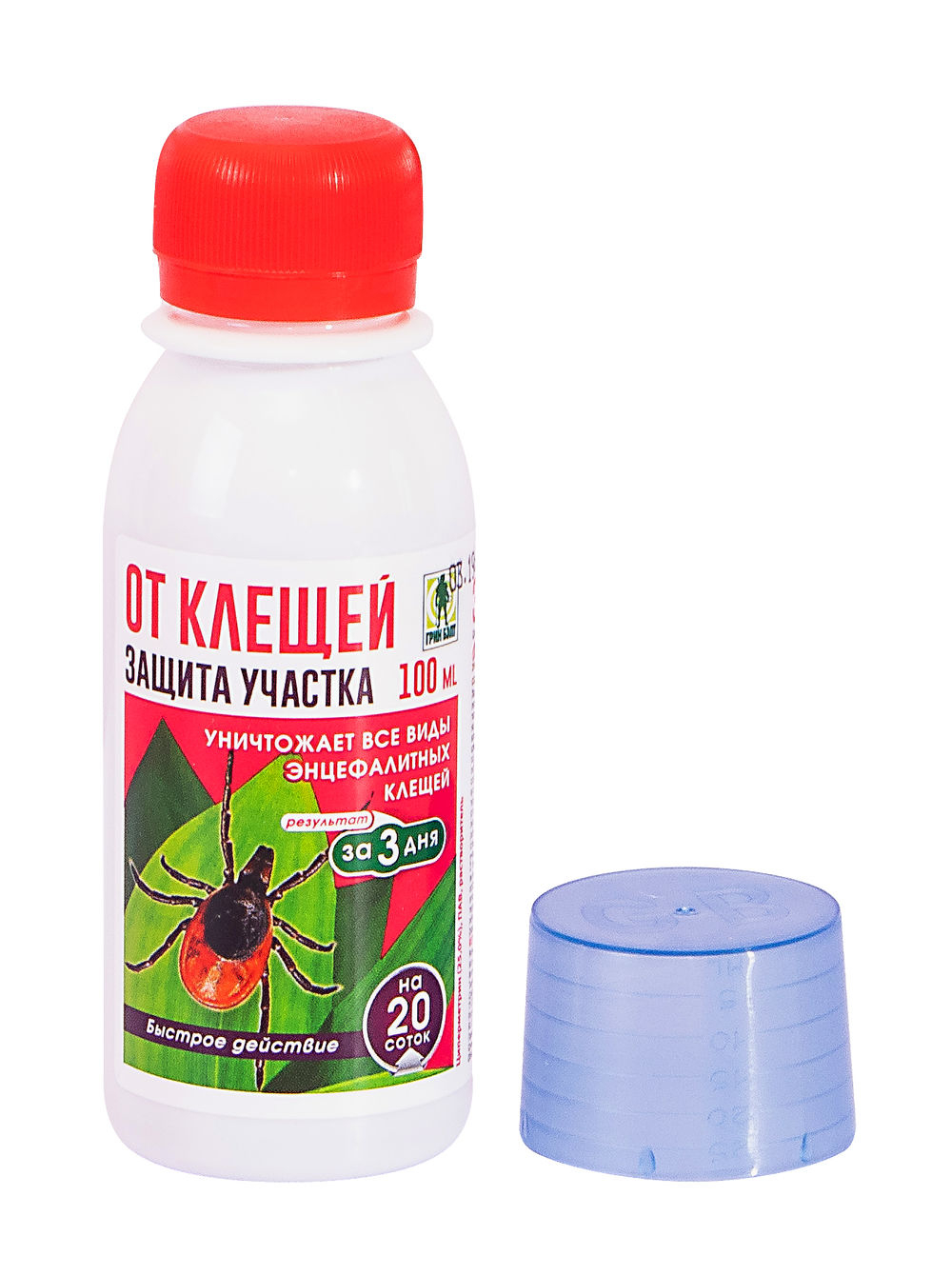 Действующее вещество – циперметрин (25%). Обработку проводить в весенне-летний период активности клещей (сразу после схода снега и до осени), желательно за 3 дня до приезда на данную территорию людей. Полное уничтожение клещей достигается через 3 дня после обработки. Средство сохраняется на траве и в почве 1-1,5 месяца.