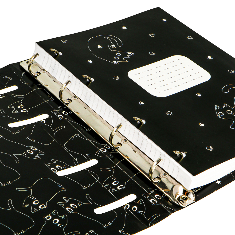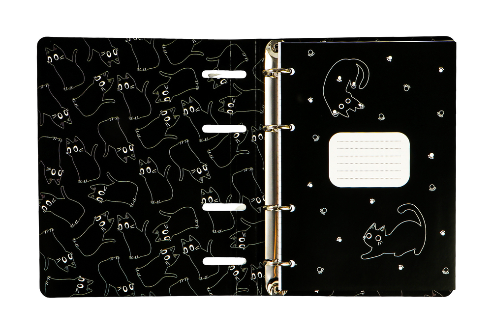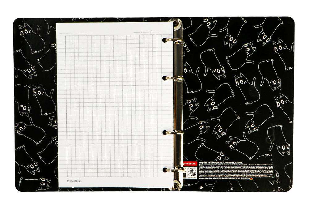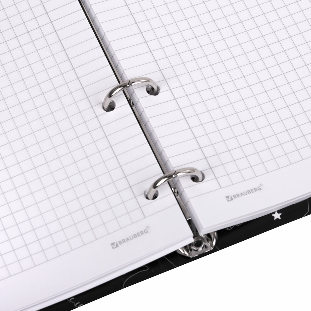 Блок состоит из 120 листов офсетной бумаги белого цвета плотностью 60 г/м2. Линовка – клетка. Обложка выполнена из плотного слим-картона с высечкой под кольцевой механизм, имеет цветной форзац и покрытие матовой пленкой. Формат А5 является стандартным, поэтому тетрадь удобно носить в рюкзаке/ранце или папке.