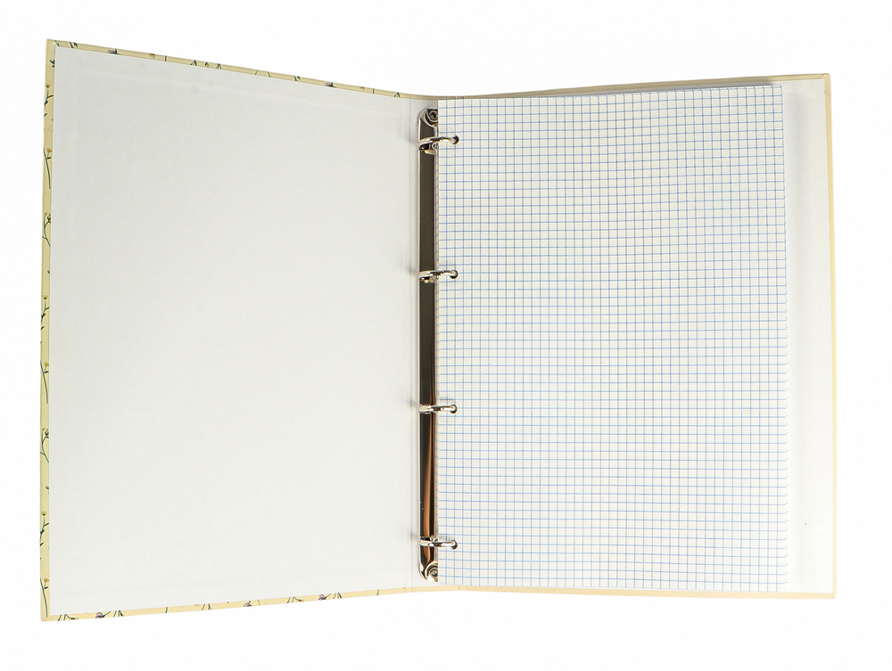 Размер внутреннего блока – 200х295 мм, что позволит защитить края листов от замятия после закрытия тетради. Диаметр колец составляет 25 мм.