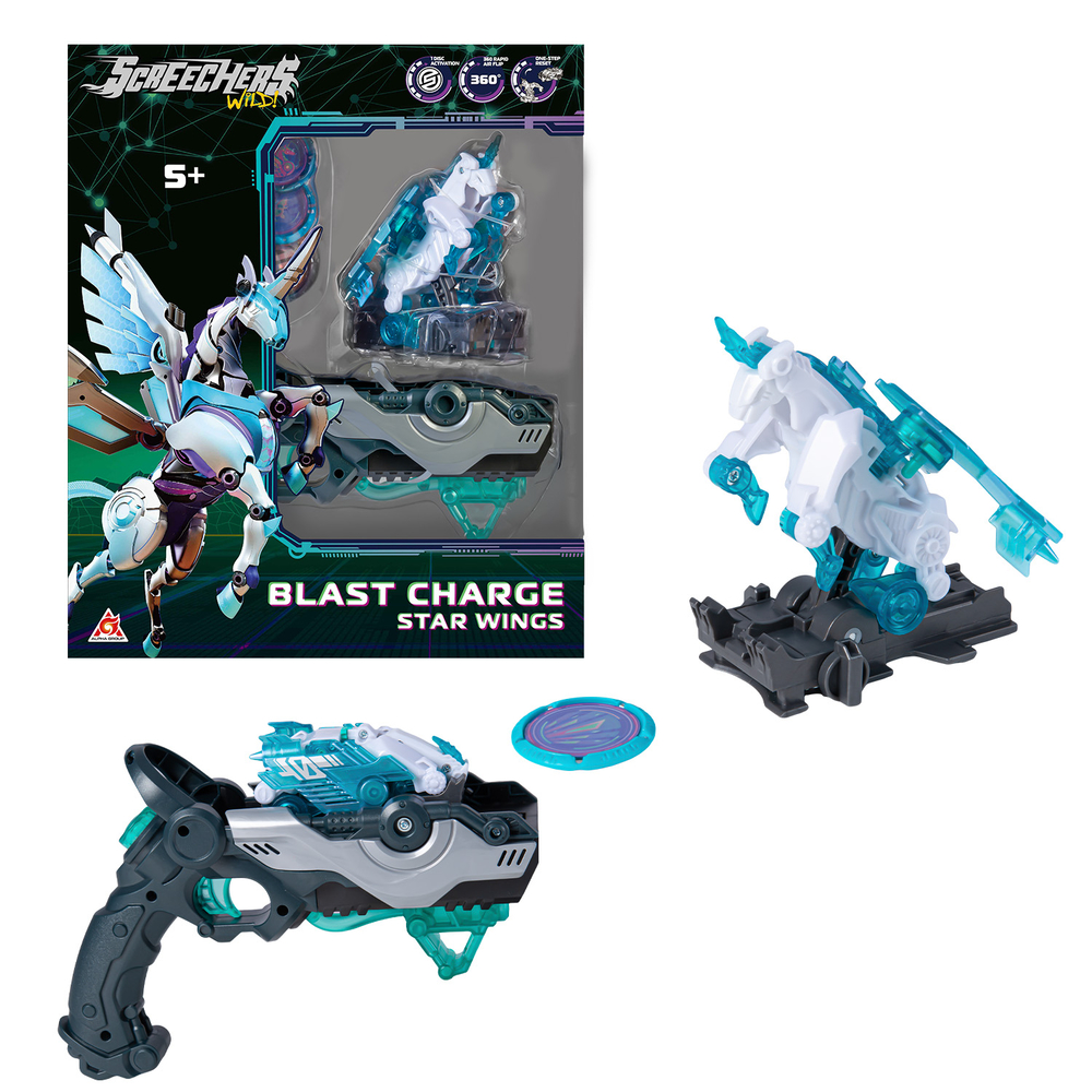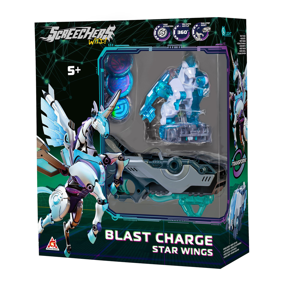 В набор входит машинка-трансформер Стар Вингс (11х11х9 см), пусковая установка Скричер-Ган (26х15х8 см), 3 энергетических диска, инструкция, наклейки. Игрушка упакована в коробку с окном 25х30х11 см.
