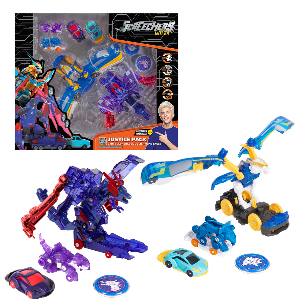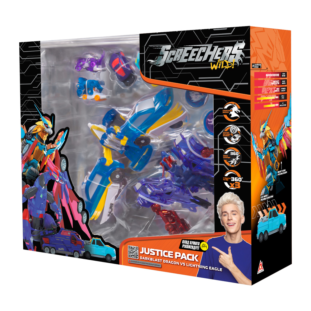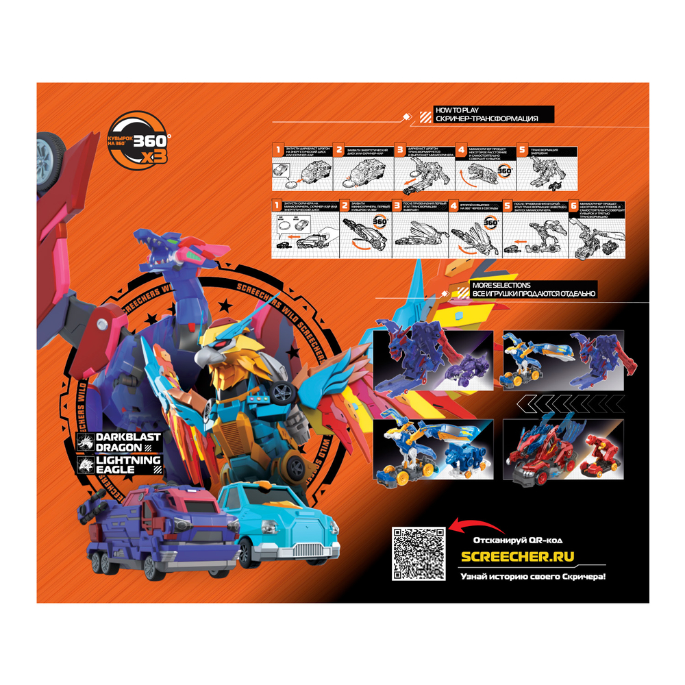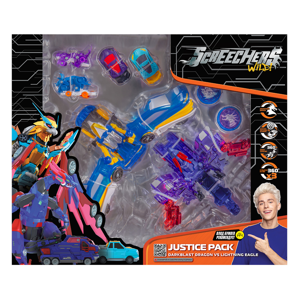В наборе: машинка-трансформер Даркбласт Дрэгон (12х29х18 см), машинка-трансформер Лайтнинг Игл L4 (29х11х15 см), 2 энергетических диска, 2 скричер-кара, 2 минискричера, 2 коллекционных карточки, инструкция.