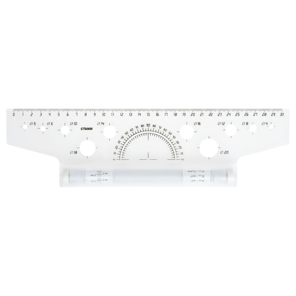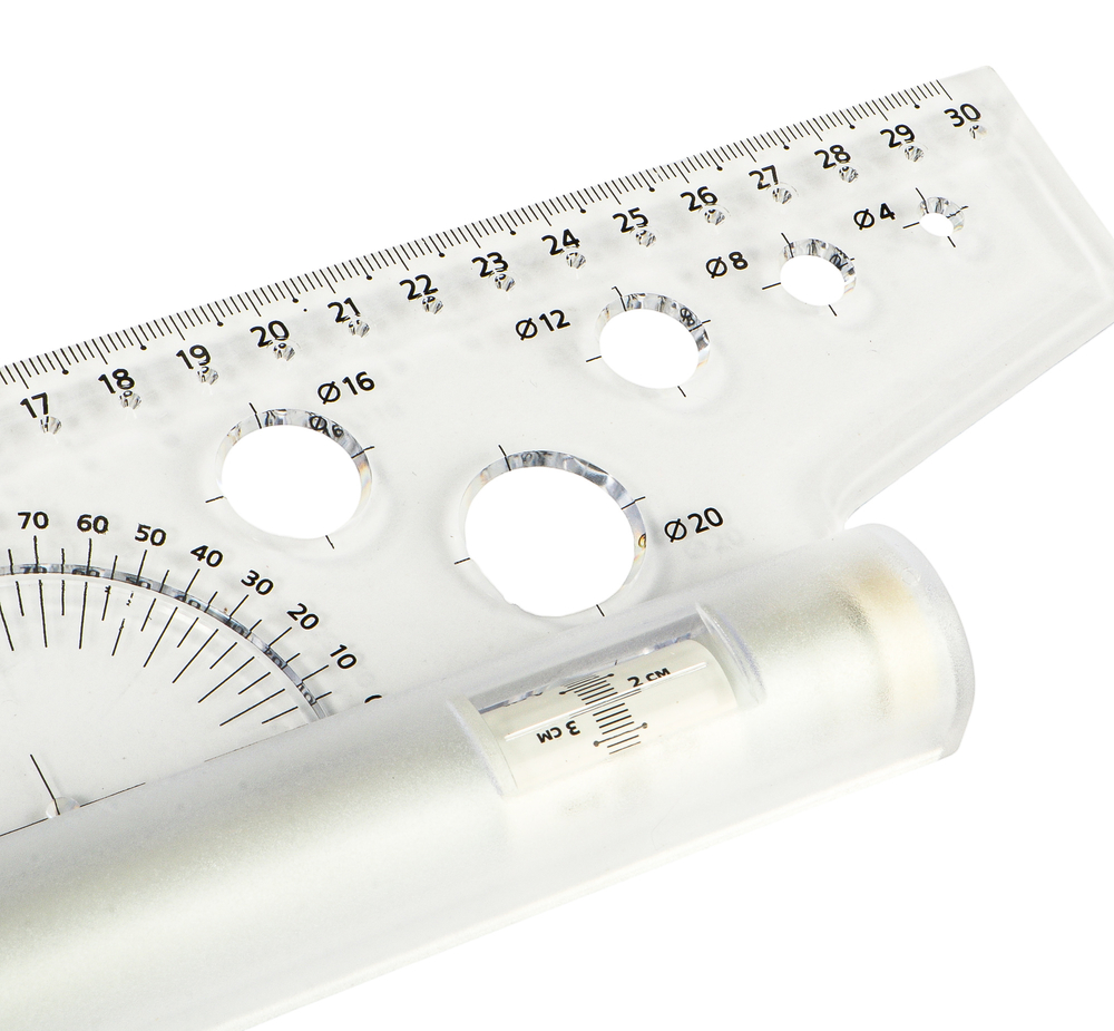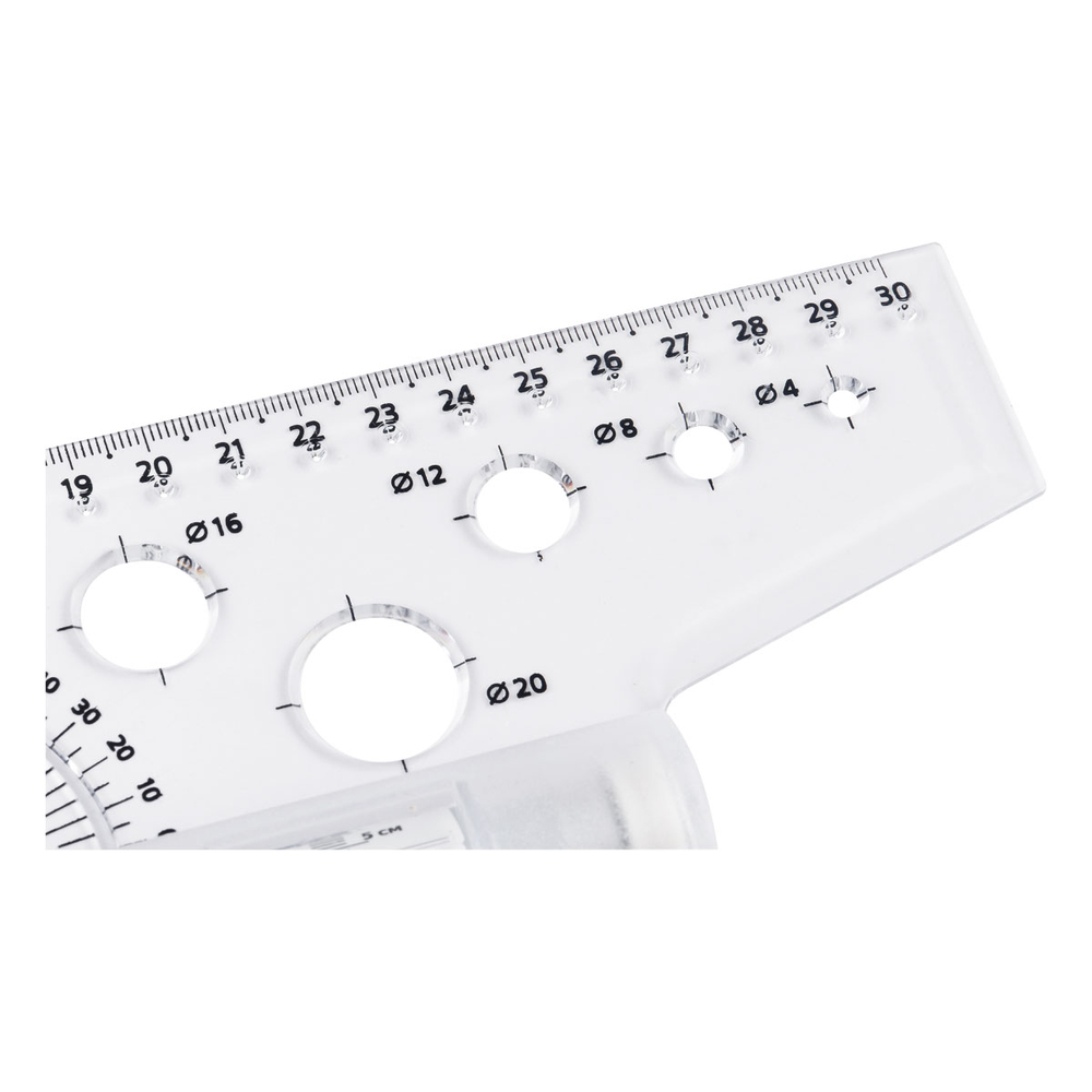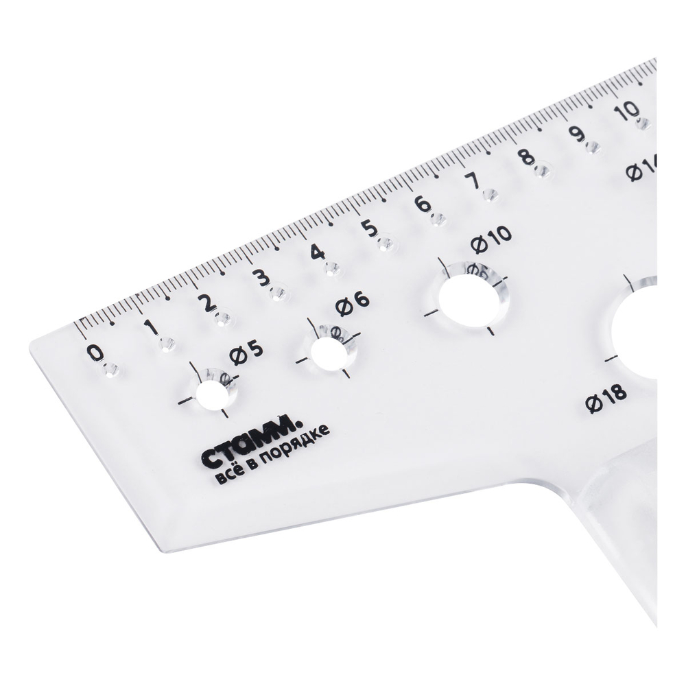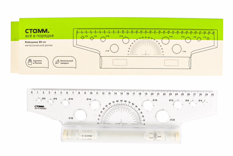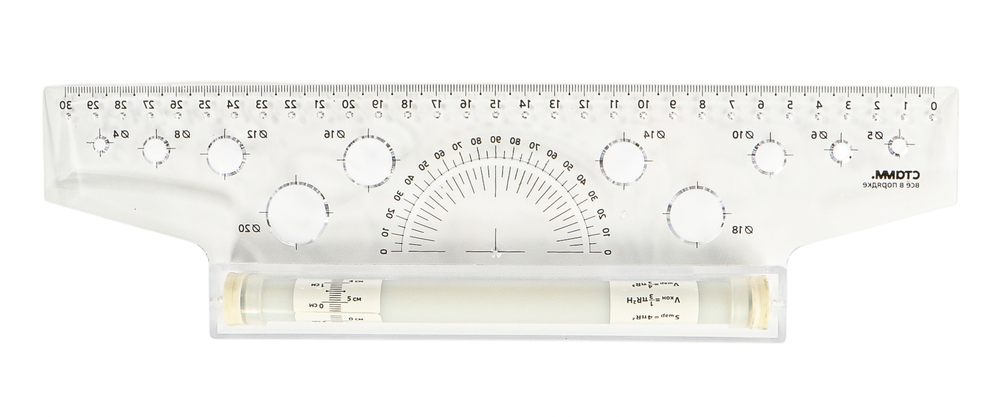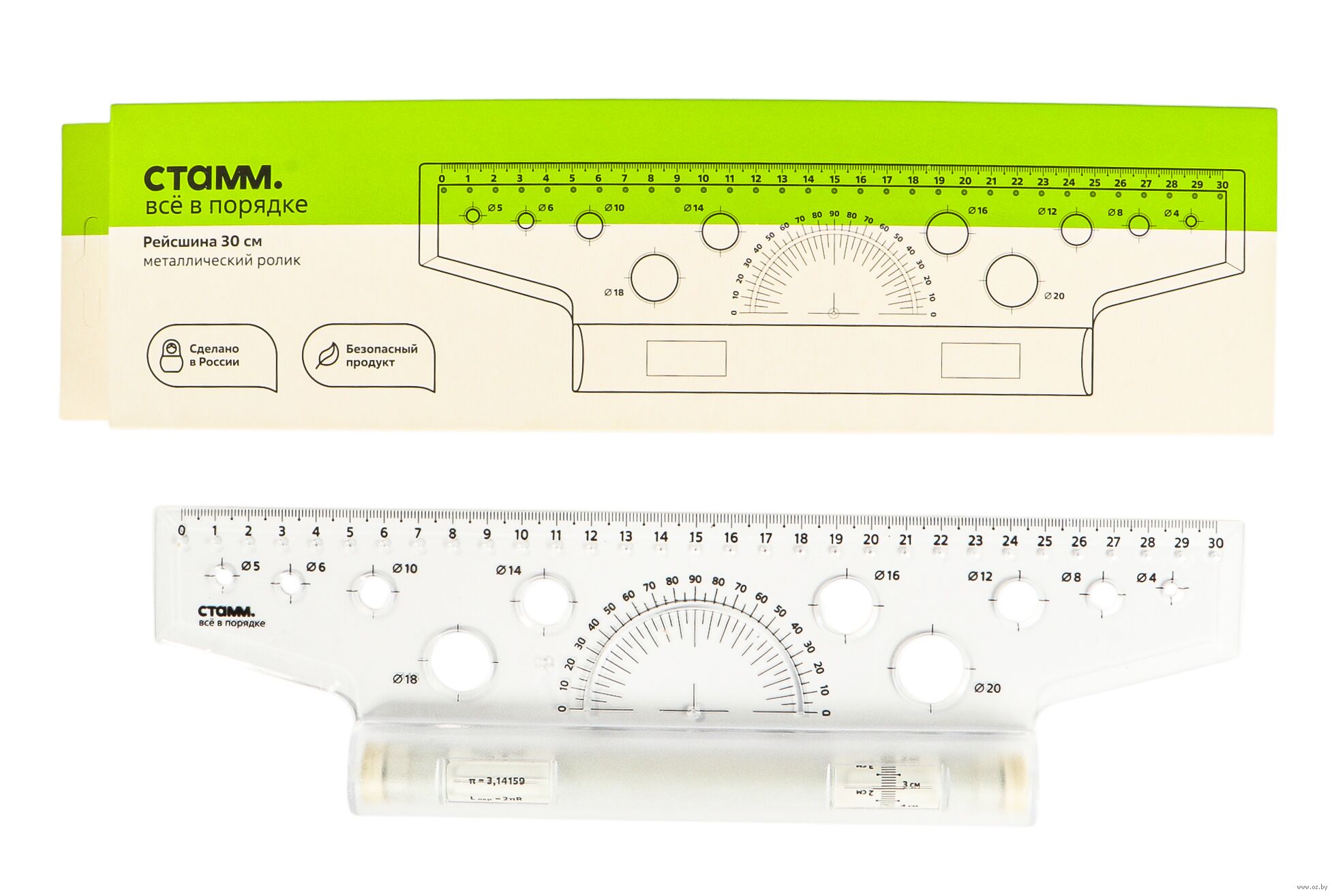 Длина шкалы – 30 см. Благодаря специальному покрытию ролика линейка не проскальзывает по бумаге. На изделии предусмотрен транспортир 180 градусов и 10 трафаретов окружностей.