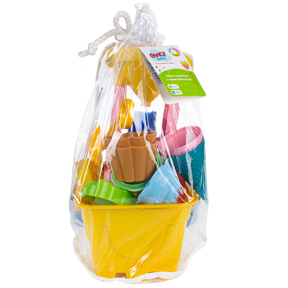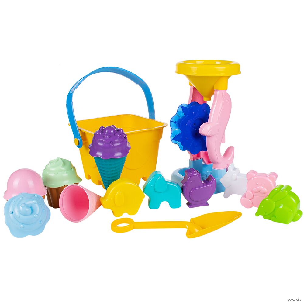 Комплектность: ведро, основания Кексики – 2 шт., основания Мороженое – 2 шт., верхушки – 4 шт., формочки Зверюшки – 6 шт., лопатка, мельничка.