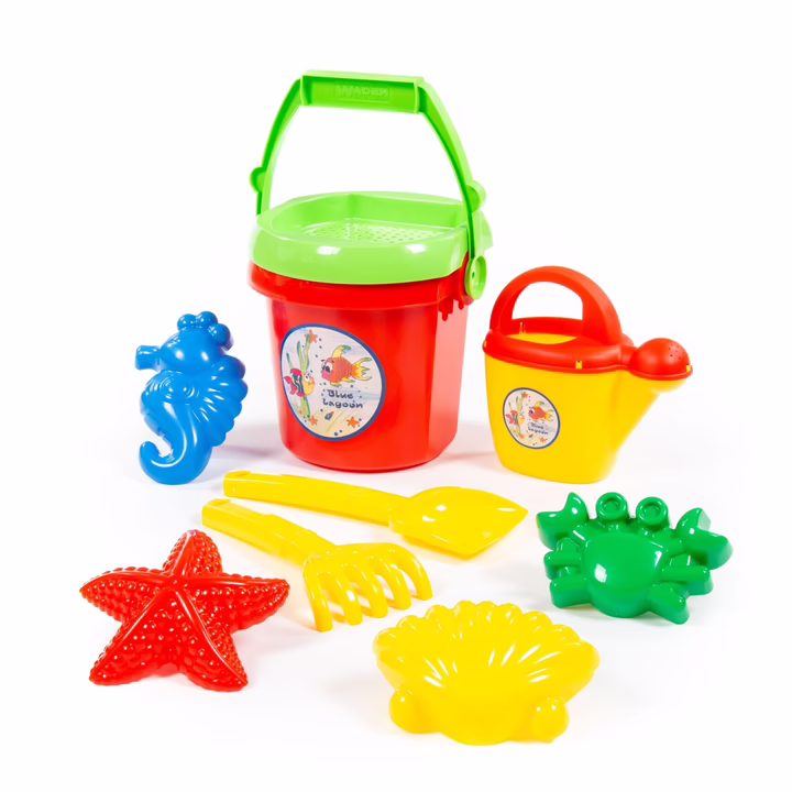 Набор содержит ведро №9, сито №9, лопатку №31, грабельки №31, формочки (морской конёк, краб, морская звезда, ракушка №1) и лейка №10.