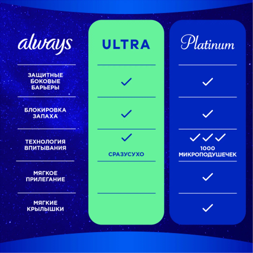 Гигиенические прокладки Always "Ultra" имеют защитные контуры и содержат гель, который впитывает и удерживает влагу, помогая предотвращать протекания. А благодаря технологии нейтрализации запаха эти прокладки запирают неприятный запах, а не маскируют его.