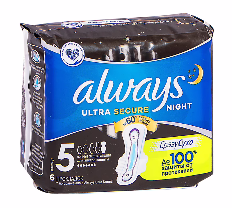 Гигиенические прокладки Always "Ultra Night" толщиной всего 3 мм обеспечивают до 100% защиты в ночное время и дарят ощущение комфорта. Always "Ultra Secure Night" (Размер 5) лучшие гигиенические прокладки Always "Ultra" для защиты в ночное время.